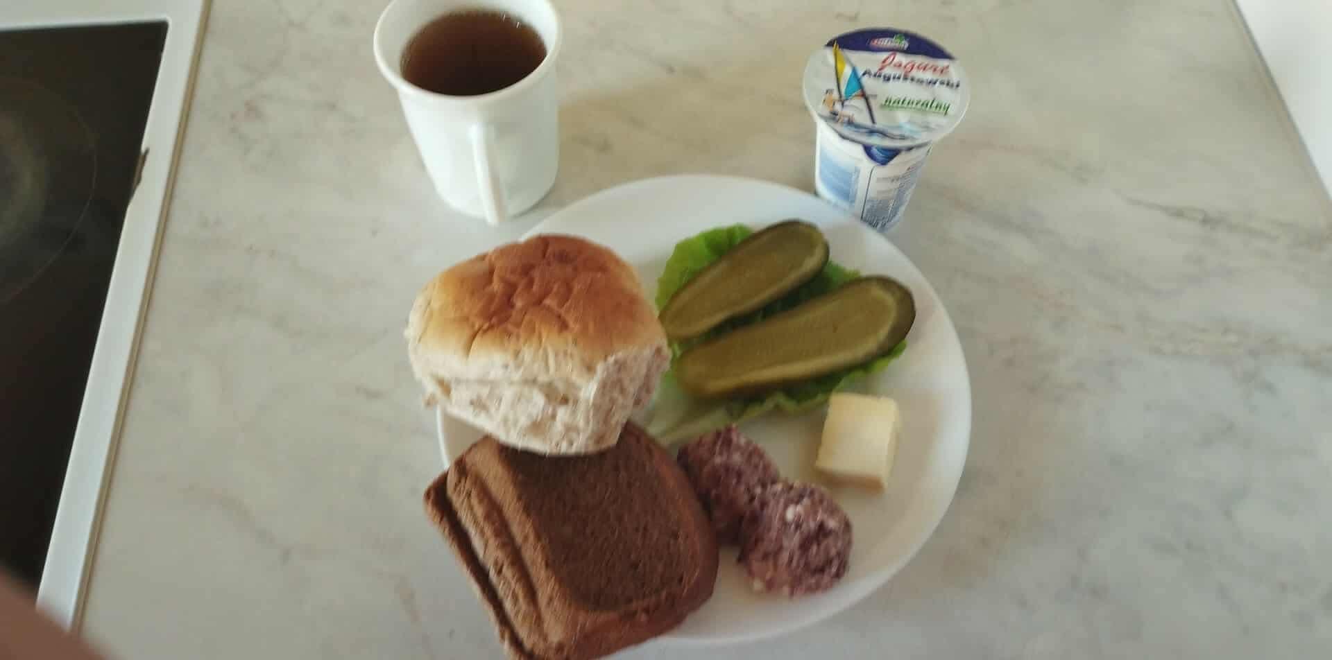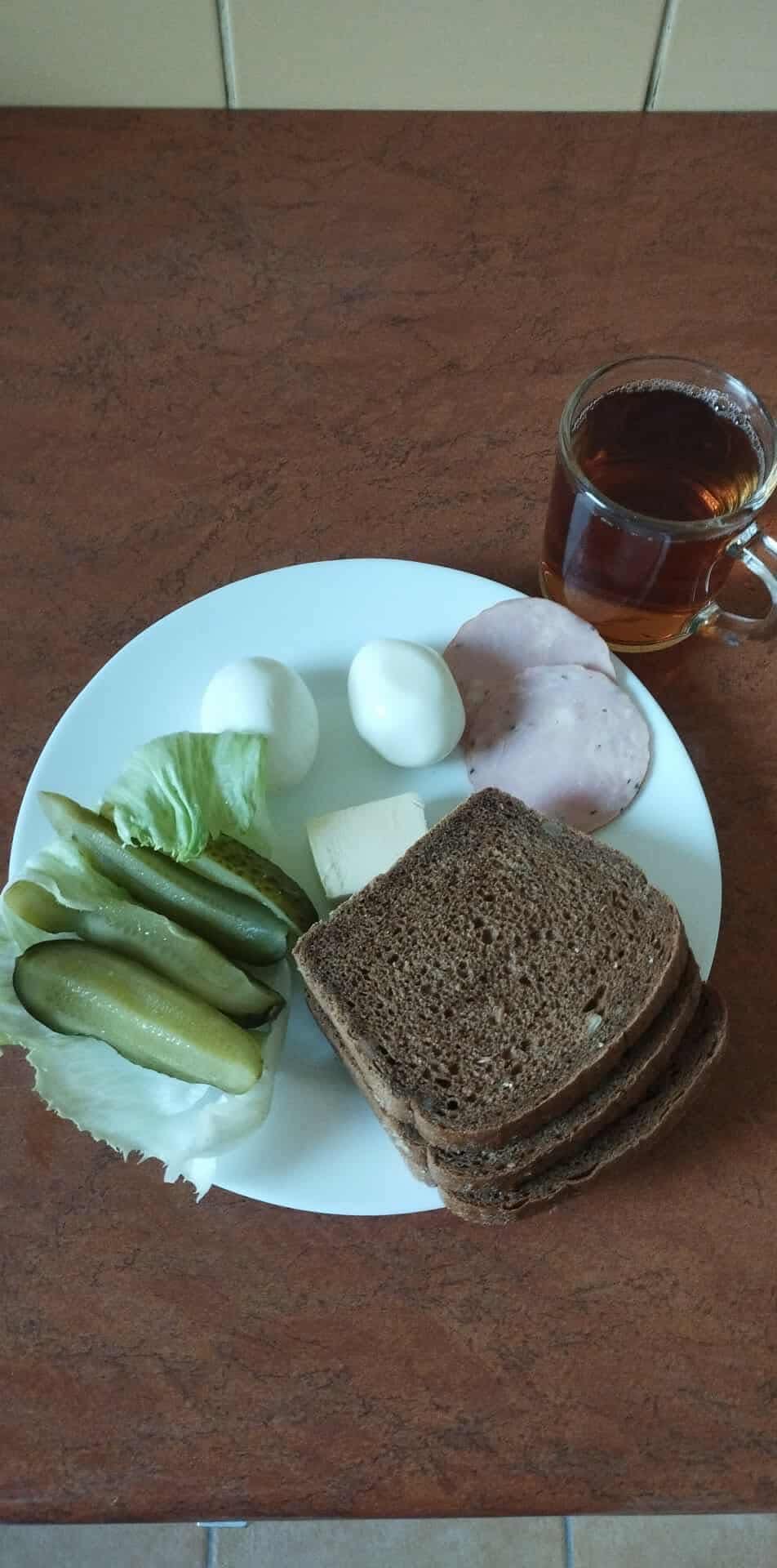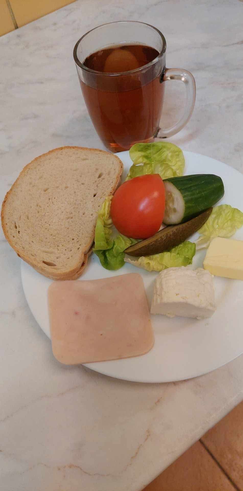 GRAMATURA: Chleb zwykły 100g (PSZENICA, ŻYTO), Masło 15g (ŚMIETANKA), Schab ze spiżarni 20g (GLUTEN, SELER, GORCZYCA ), Jajko gotowane kl. L 1szt (JAJA), Ogórekkonserwowy 50g (S02), Sałata masłowa 5g , Herbata 250ml