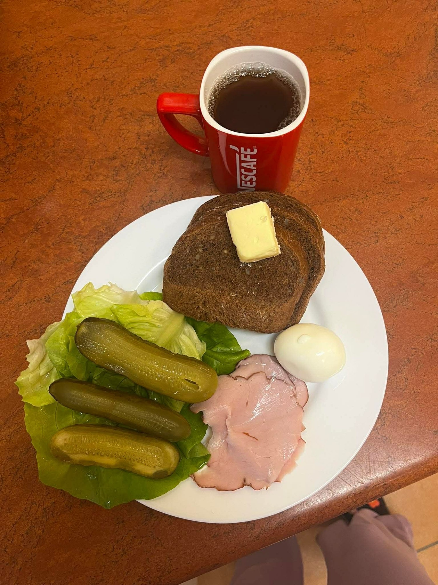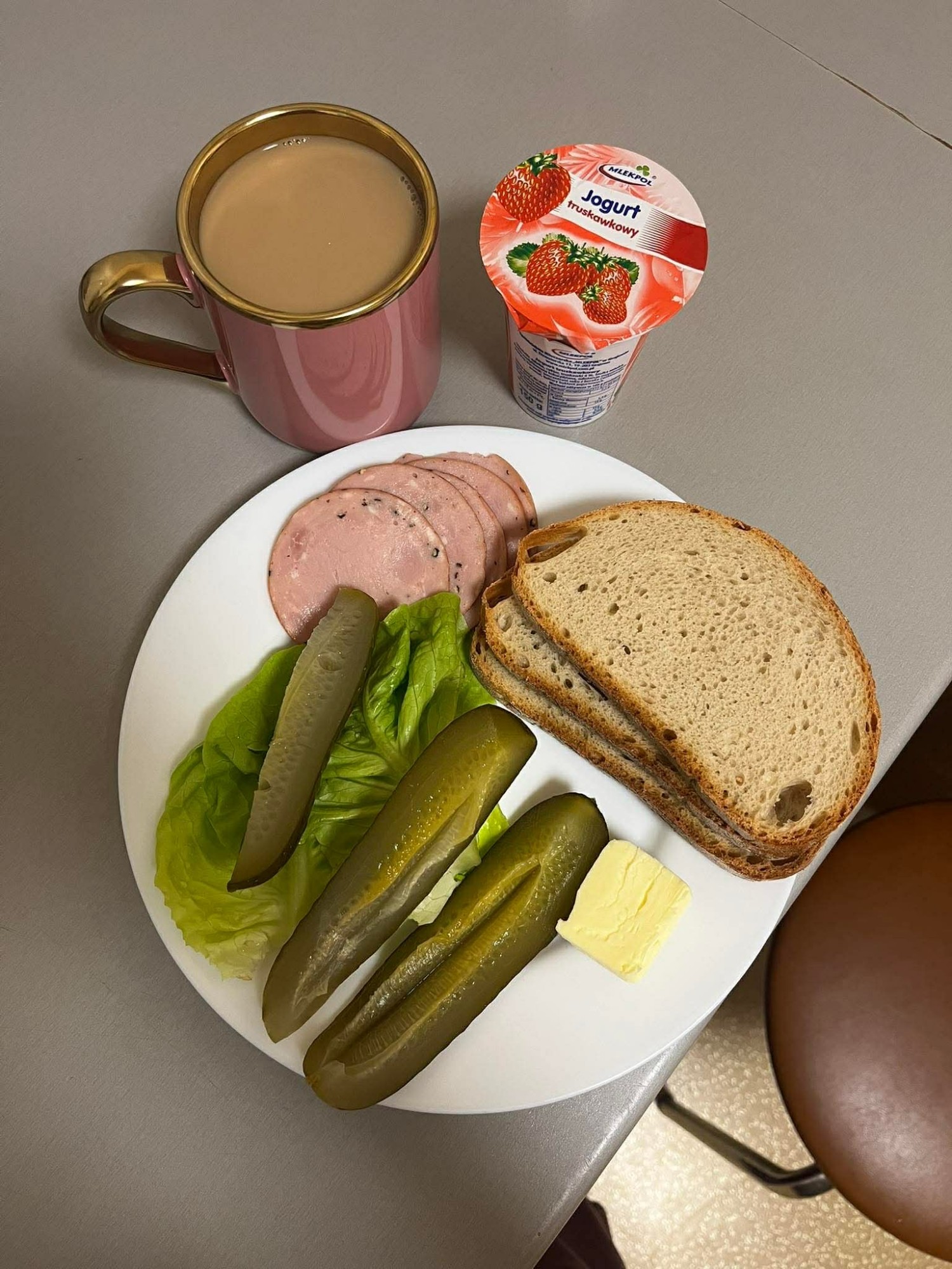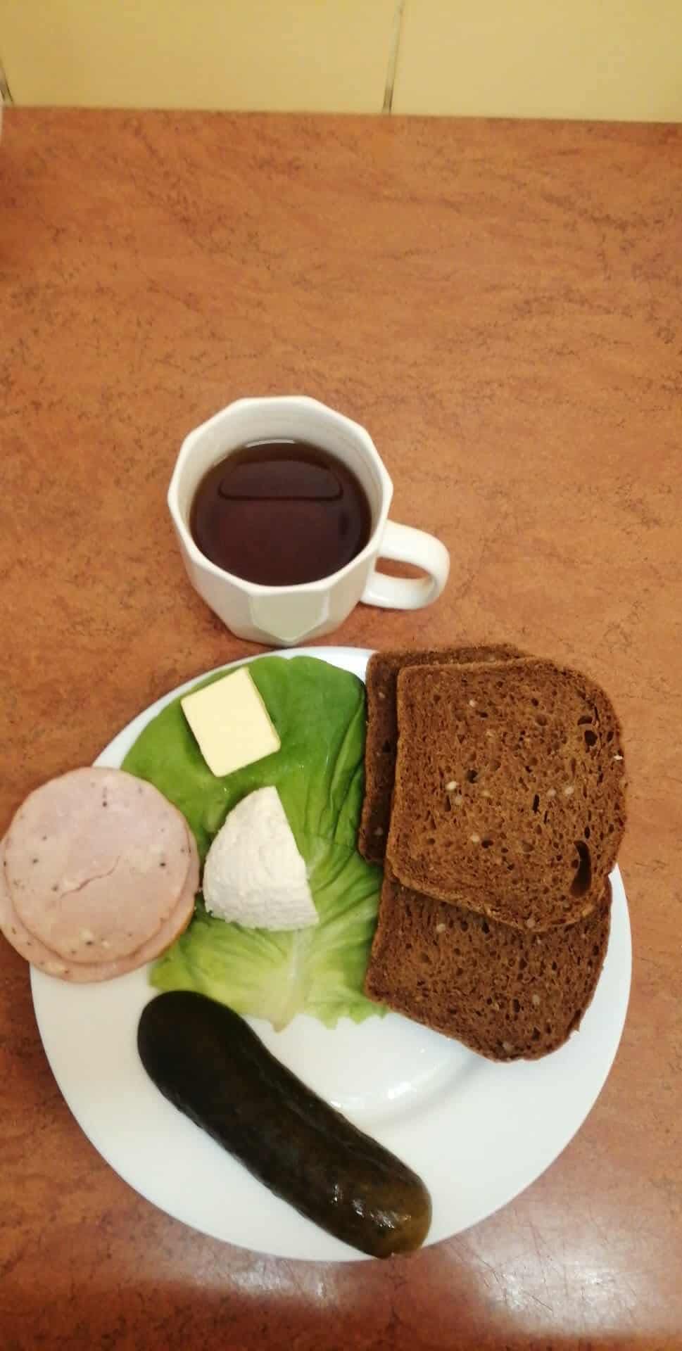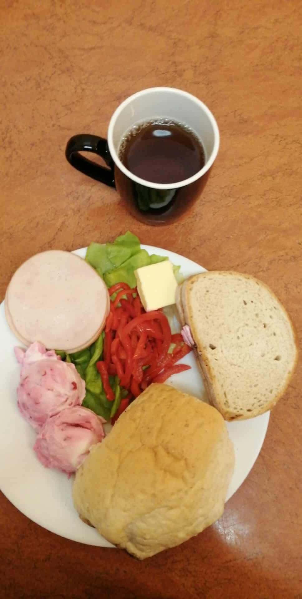 GRAMATURA: Chleb zwykły 100g (PSZENICA, ŻYTO), Masło 15g (ŚMIETANKA), Schab ze spiżarni 20g (GLUTEN, SELER, GORCZYCA ), Jajko gotowane kl. L 1szt (JAJA), Ogórekkonserwowy 50g (S02), Sałata masłowa 5g , Herbata 250ml
