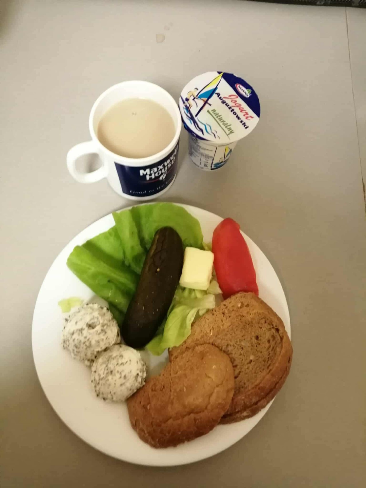 GRAMATURA: Chleb razowy 100g (MLEKO, JĘCZMIEŃ, PSZENICA, ŻYTO), Masło 15g (ŚMIETANKA), Twarożek z ziołami 50g (MLEKO, GORYCZYCA, ŁUBIN, SEZAM), Ogórek konserwowy 50g (S02, GORYCZYCA ), Papryka 30 g, Sałata masłowa 5g , Kawa zbożowa. 250g (MLEKO, JĘCZMIEŃ, ŻYTO), II Śniadanie: Jogurt naturalny 1szt (MLEKO)
