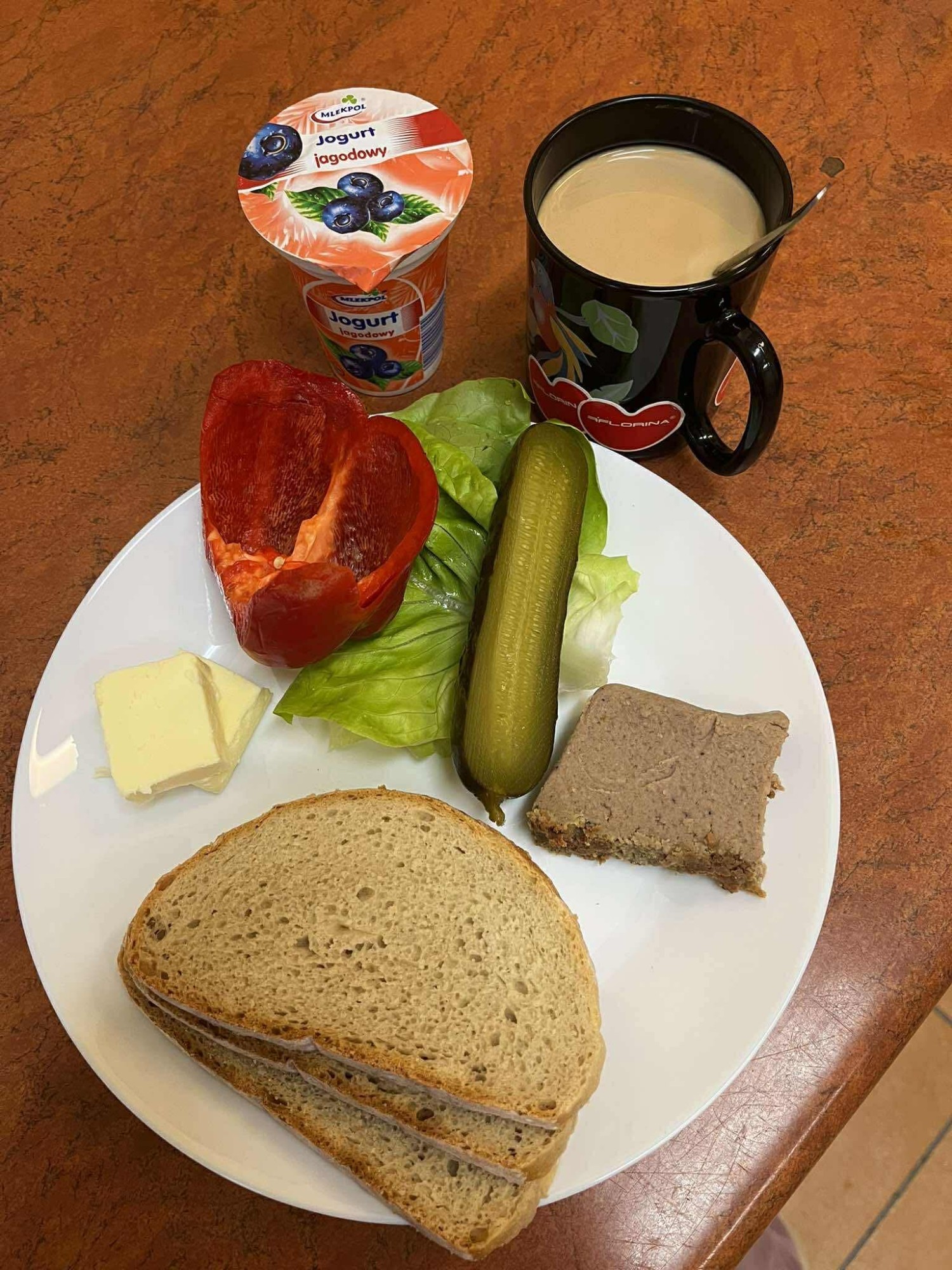 GRAMATURA: Chleb zwykły 100g (PSZENICA, ŻYTO), Masło 15g (ŚMIETANKA), Pasztet drobiowy 50g ,Ogórek kiszony 50g, Papryka 50 g, Kawa zbożowa. 250g (MLEKO, ŻYTO, JĘCZMIEŃ ), Sałata masłowa 5g , II Śniadanie: Jogurt owocowy 1szt (MLEKO)