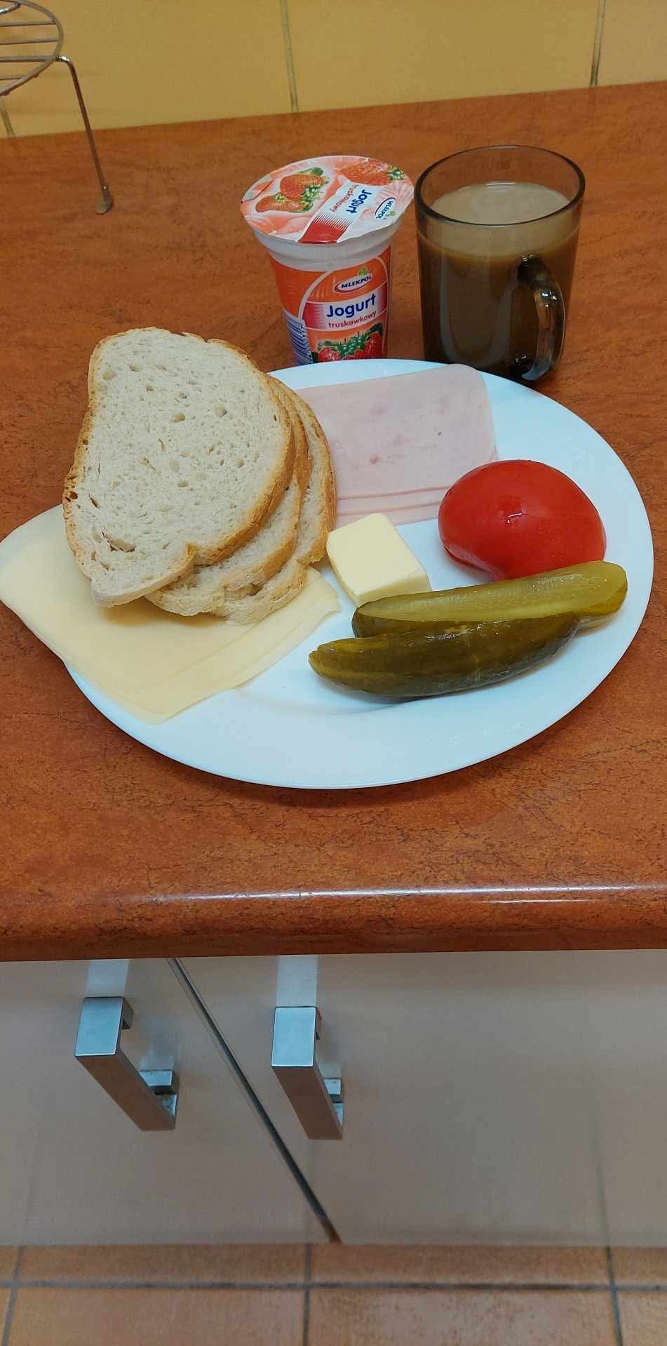 GRAMATURA: Chleb zwykły 100g (PSZENICA, ŻYTO), Masło 15g (ŚMIETANKA), Wędlina 50g (MLEKO, S02, GORYCZYCA ), Ser żółty 30 g (LAKTOZA), Pomidor 50g , Ogórek konserwowy 30g ( S02, GORYCZYCA ), Kawa zbożowa. 250g (MLEKO, JĘCZMIEŃ, ŻYTO), II Śniadanie: Jogurt owocowy 1szt (MLEKO)