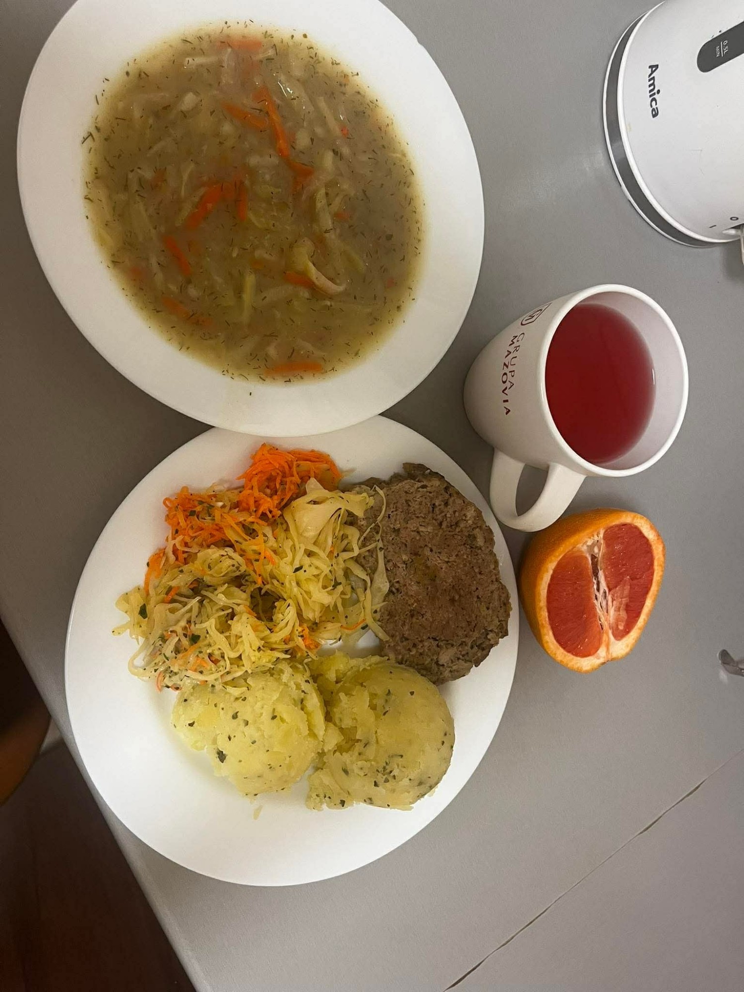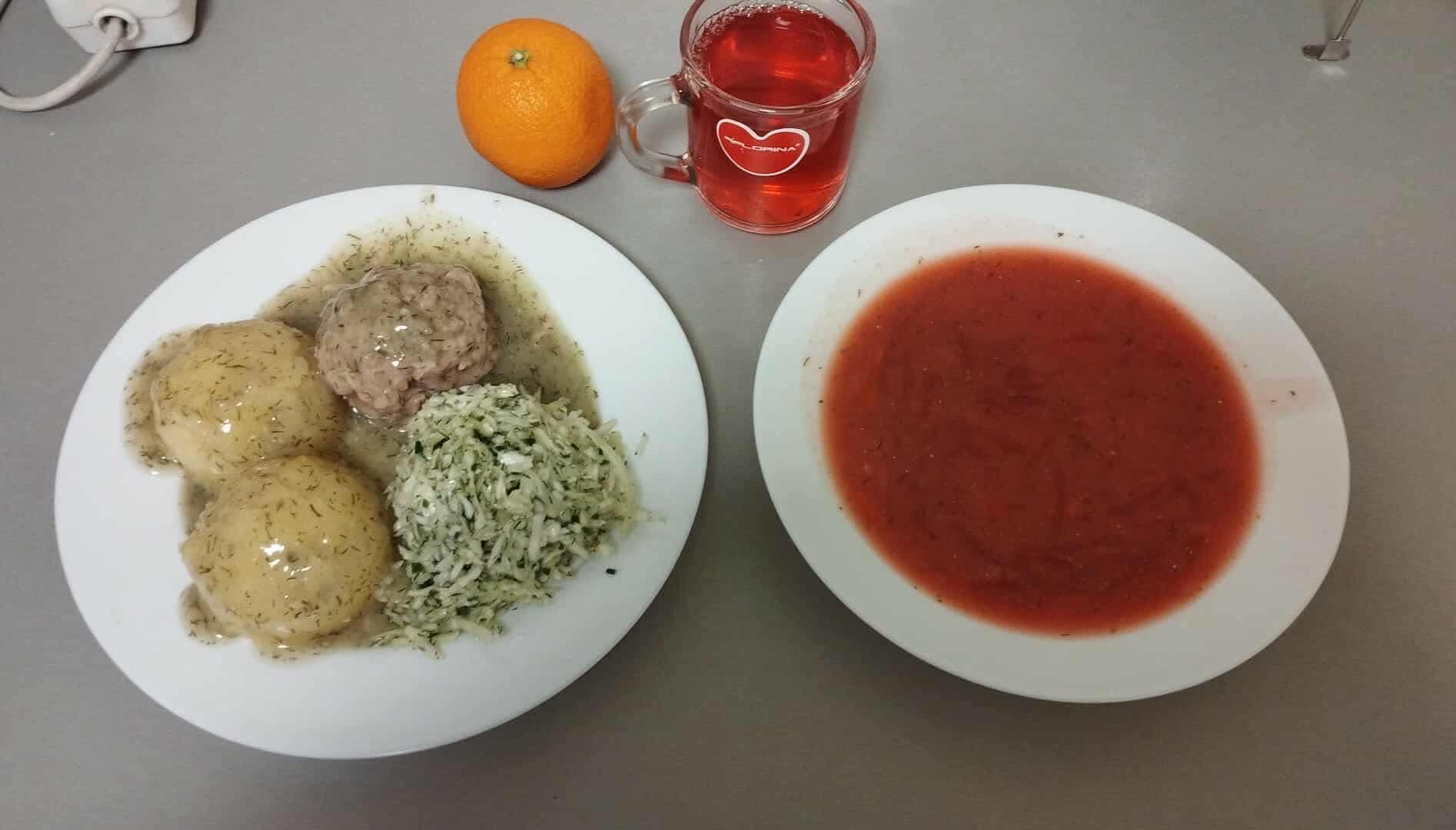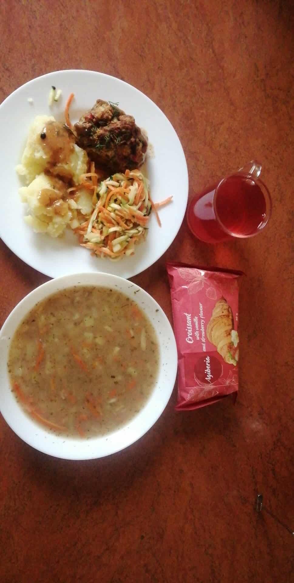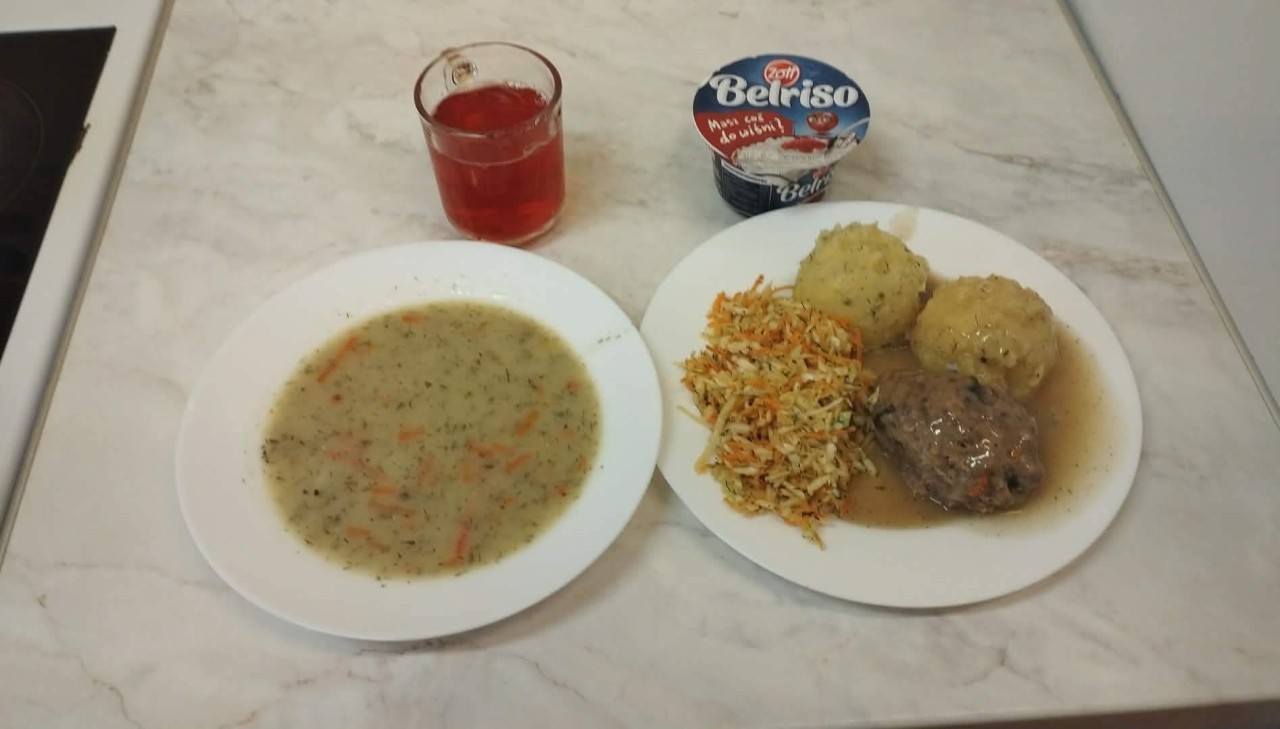 GRAMATURA: Kapuśniak z kapusty kiszonej z ziemniakami 350ml (MLEKO, PSZENICA, SELER, GORCZYCA, BIAŁKO JAJ), Krokiety z mięsem 2szt , Surówka z kapusty czerwonej z marchewką 100g , Kompot owocowy 250ml (S02)