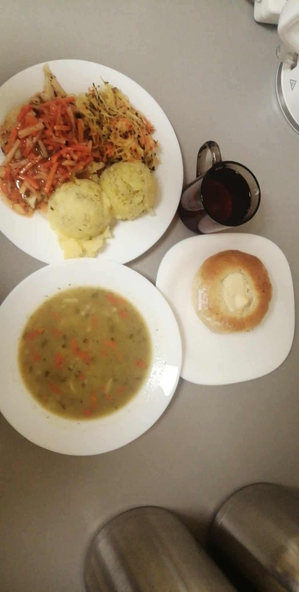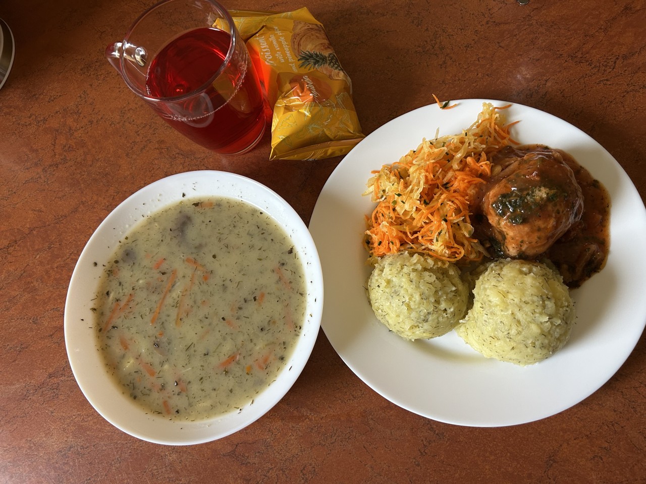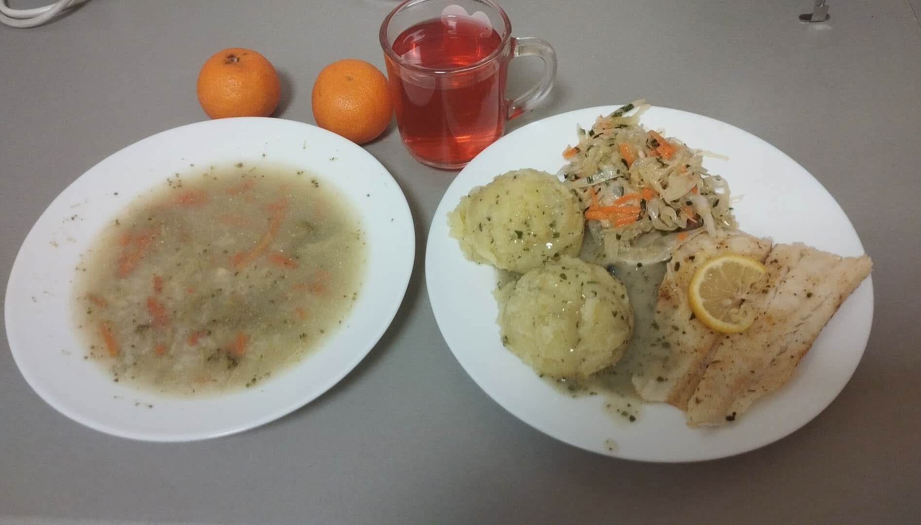 GRAMATURA: Kapuśniak z kapusty kiszonej z ziemniakami 350ml (MLEKO, PSZENICA, SELER, GORCZYCA, BIAŁKO JAJ), Krokiety z mięsem 2szt , Surówka z kapusty czerwonej z marchewką 100g , Kompot owocowy 250ml (S02)