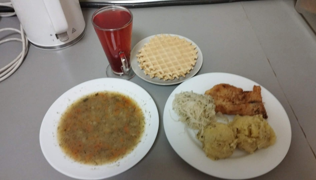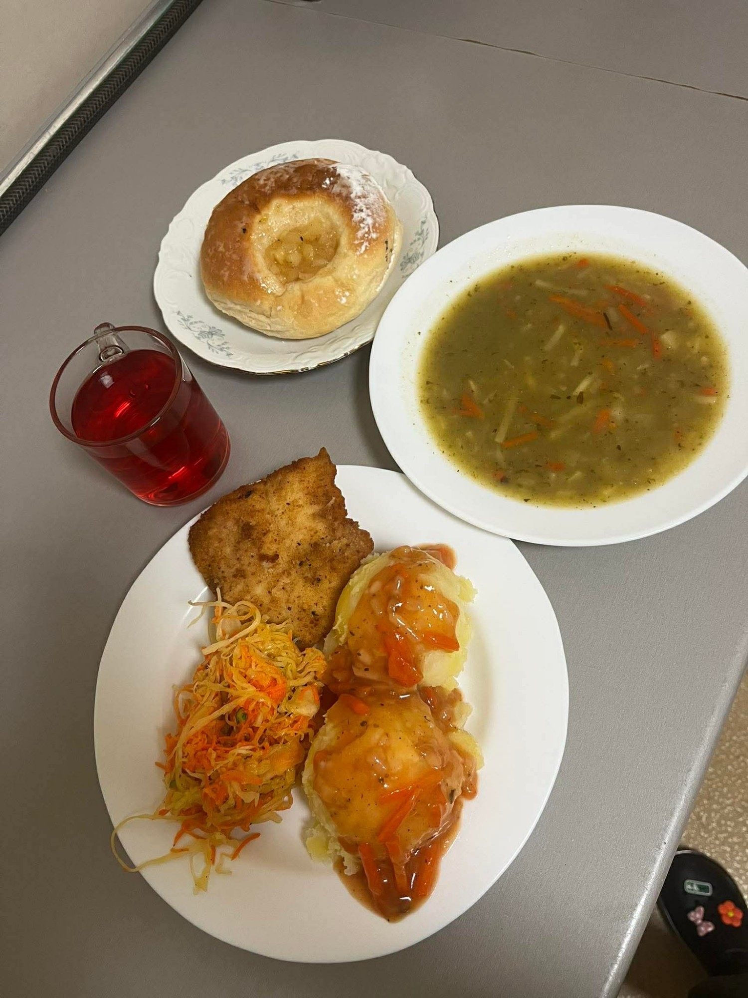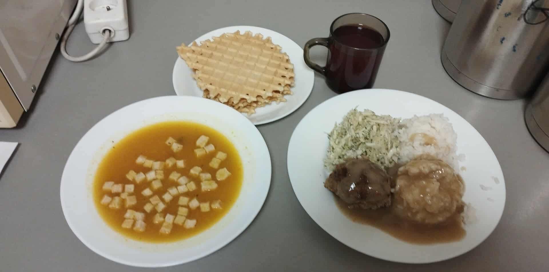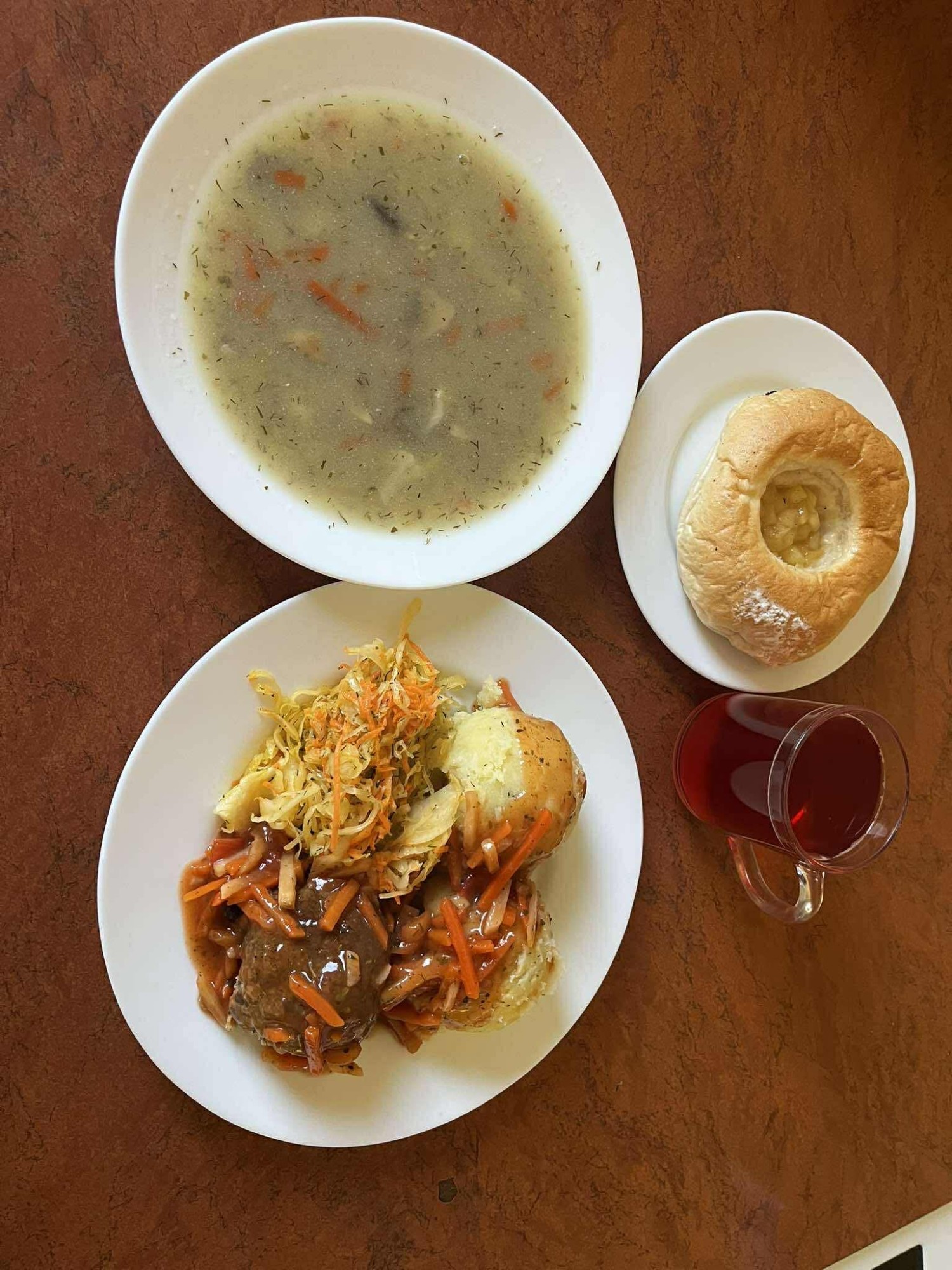 GRAMATURA: Kapuśniak z kapusty kiszonej z ziemniakami 350ml (MLEKO, PSZENICA, SELER, GORCZYCA, BIAŁKO JAJ), Krokiety z mięsem 2szt , Surówka z kapusty czerwonej z marchewką 100g , Kompot owocowy 250ml (S02)
