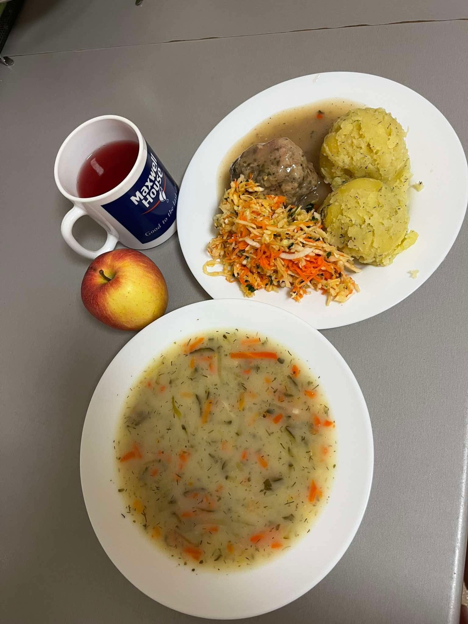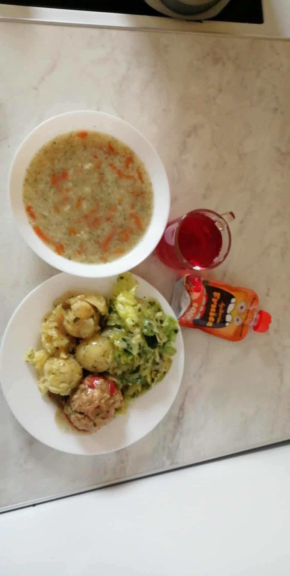 GRAMATURA: Zupa jarzynowa z makaronem 350ml (GLUTEN, JAJA, SELER, SOJA), Pulpet wieprzowy duszony 100g (MLEKO, JAJA, PSZENICA, SELER, GORCZYCA, SEZAM, ŁUBIN, ŻYTO), Ziemniaki 200g , Surówka colesław 100g (GLUTEN, JAJA, SELER, SEZAM), Kompot owocowy 250ml (S02)