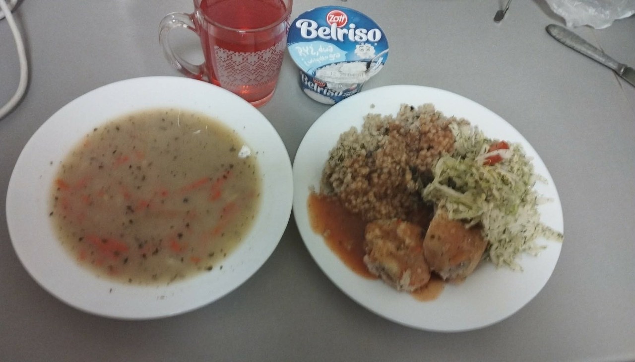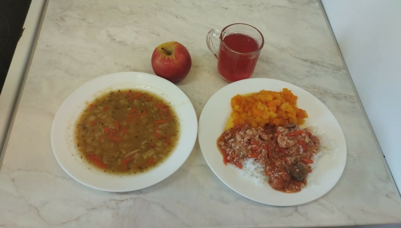 GRAMATURA: Krupnik z kaszą jaglaną i ziemniakami 350ml (SELER, SOJA), Makaron z sosem bolońskim 350g (MLEKO, GLUTEN, JAJA, ORZECHY AR, SELER, GORCZYCA, SEZAM, ŁUBIN ), Kompot owocowy 250ml (S02)