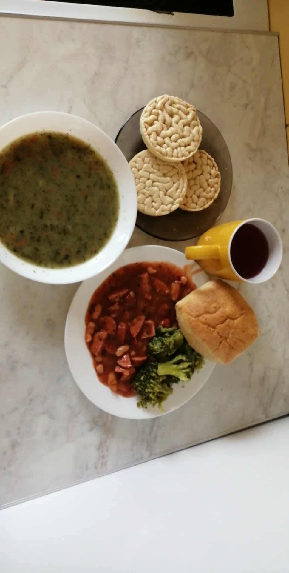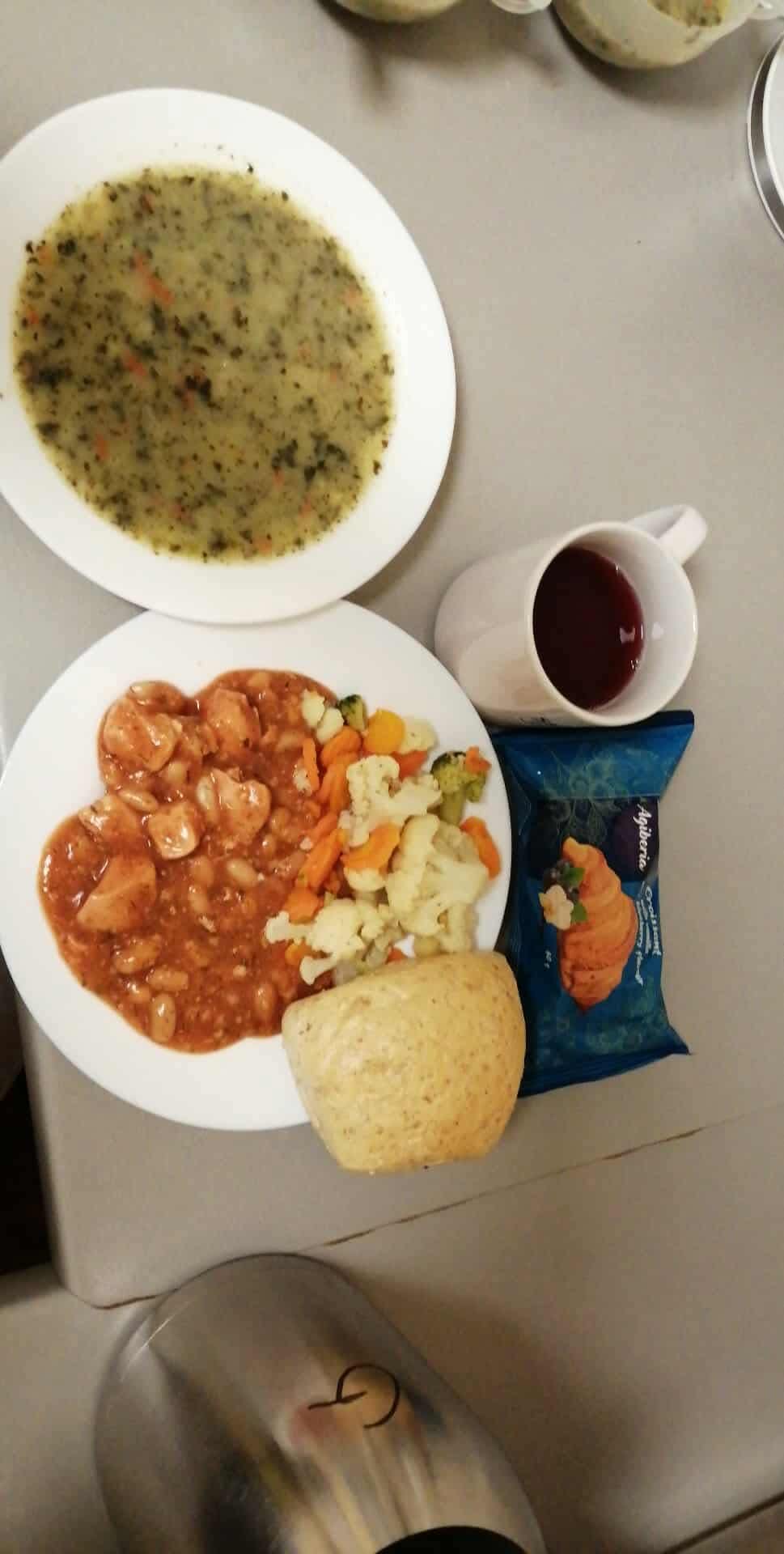 GRAMATURA: Zupa szpinakowa z ziemniakami 350ml ( PSZENICA, SELER, SOJA), Fasolka po bretońsku lekka z mięsem drobiowym 350g (SELER, OWIES), Bułka grahamka 1szt (PSZENICA, ŻYTO), Bukiet jarzyn na parze 100g (SELER), Kompot owocowy 250ml (S02), Podwieczorek: Croissant z nadzieniem 1szt.