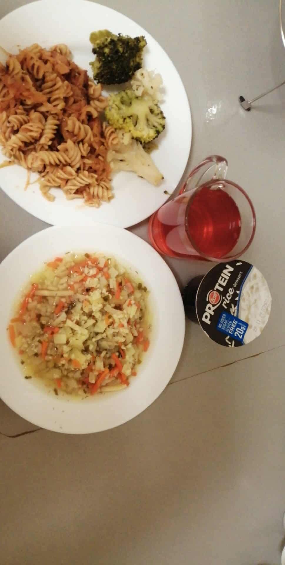 GRAMATURA: Zupa minestrone z ziemniakami 350ml ( GLUTEN, JAJA, PSZENICA, SELER, SOJA ), Makaron razowy z serem i masłem 350g ( MLEKO, GLUTEN, JAJA, ŚMIETANKA), Surówka z marchewki i ananasa 150g , Kompot owocowy 250ml ( S02)