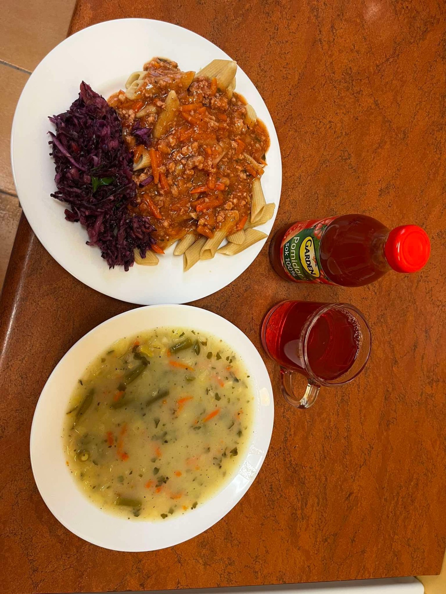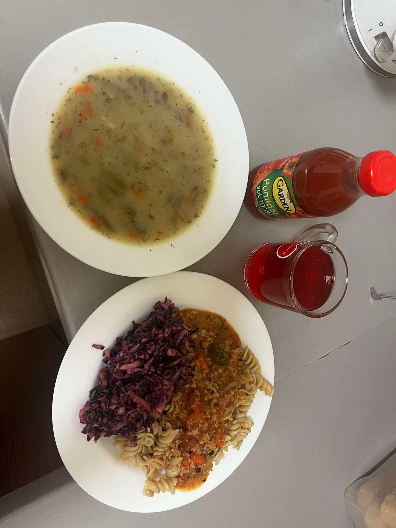GRAMATURA: Zupa z fasolką szparagową i ziemniakami 350ml (PSZENICA, SELER), Makaron razowy z sosem bolońskim 350g (GLUTEN, JAJA, ORZECHY AR, SELER, GORCZYCA, SEZAM, ŁUBIN ), Surówka z kapusty czerwonej z jabłkiem 100g , Kompot owocowy 250ml (S02), Podwieczorek: Sok pomidorowy 1 szt. 300ml