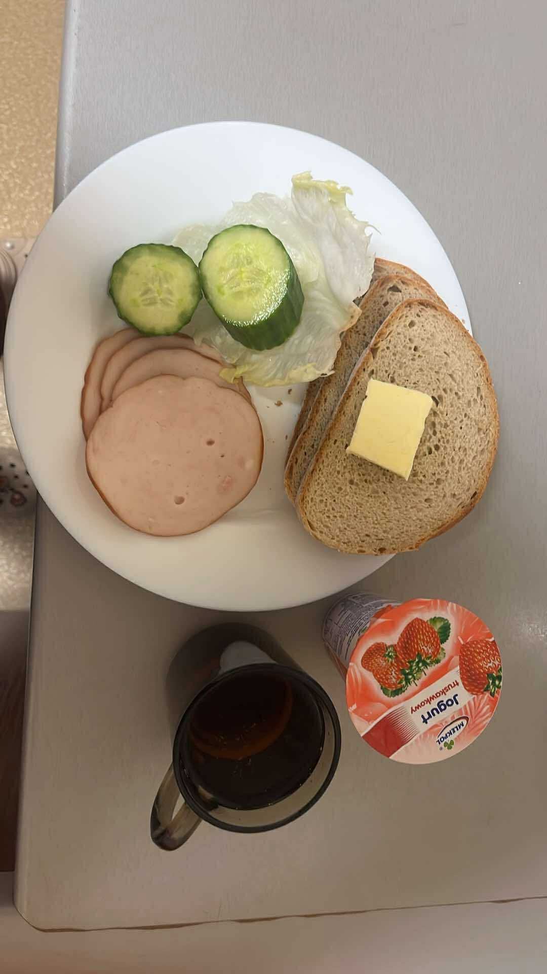 GRAMATURA: Pieczywo mieszane 100g (MLEKO, PSZENICA, ŻYTO, JĘCZMIEŃ), Masło extra 15g (ŚMIETANKA), Szynka piastowska 50g , Ogórek zielony 50g, Herbata 250ml, II Śniadanie: Jogurt owocowy 150g 1szt (MLEKO)
