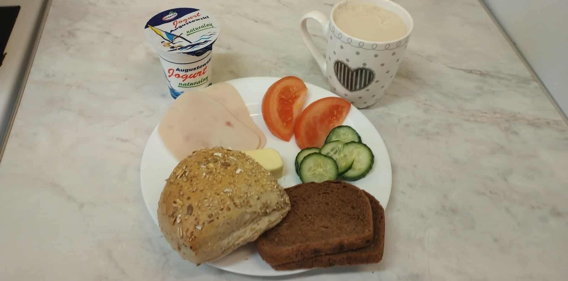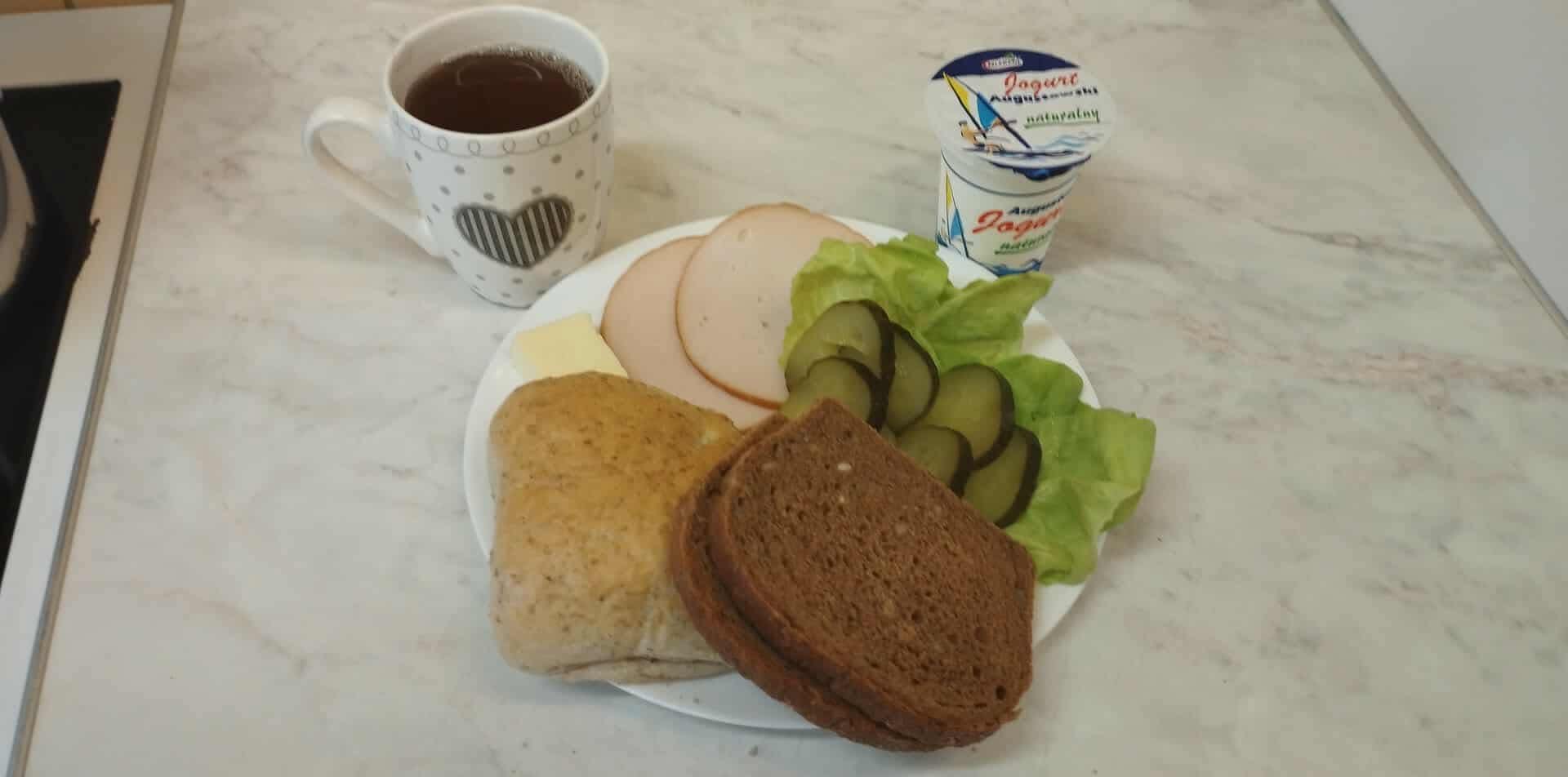 GRAMATURA: Pieczywo mieszane 100g (MLEKO, PSZENICA, ŻYTO, JĘCZMIEŃ), Masło extra 15g (ŚMIETANKA), Krakowska parzona 50g, Sałata 5 g, Ogórek zielony 40g, Herbata 250ml, II Śniadanie: Jogurt naturalny 150g 1szt (MLEKO)