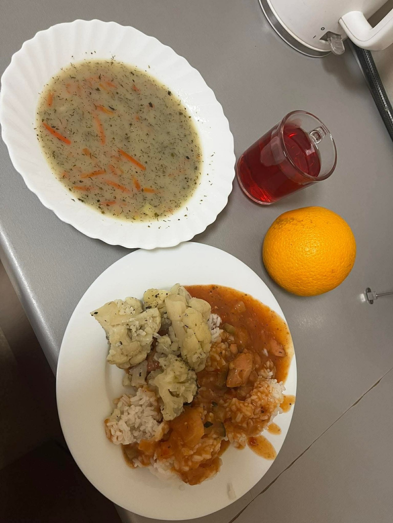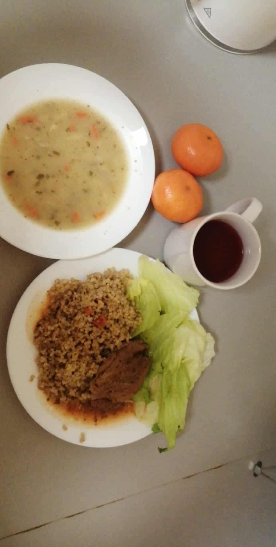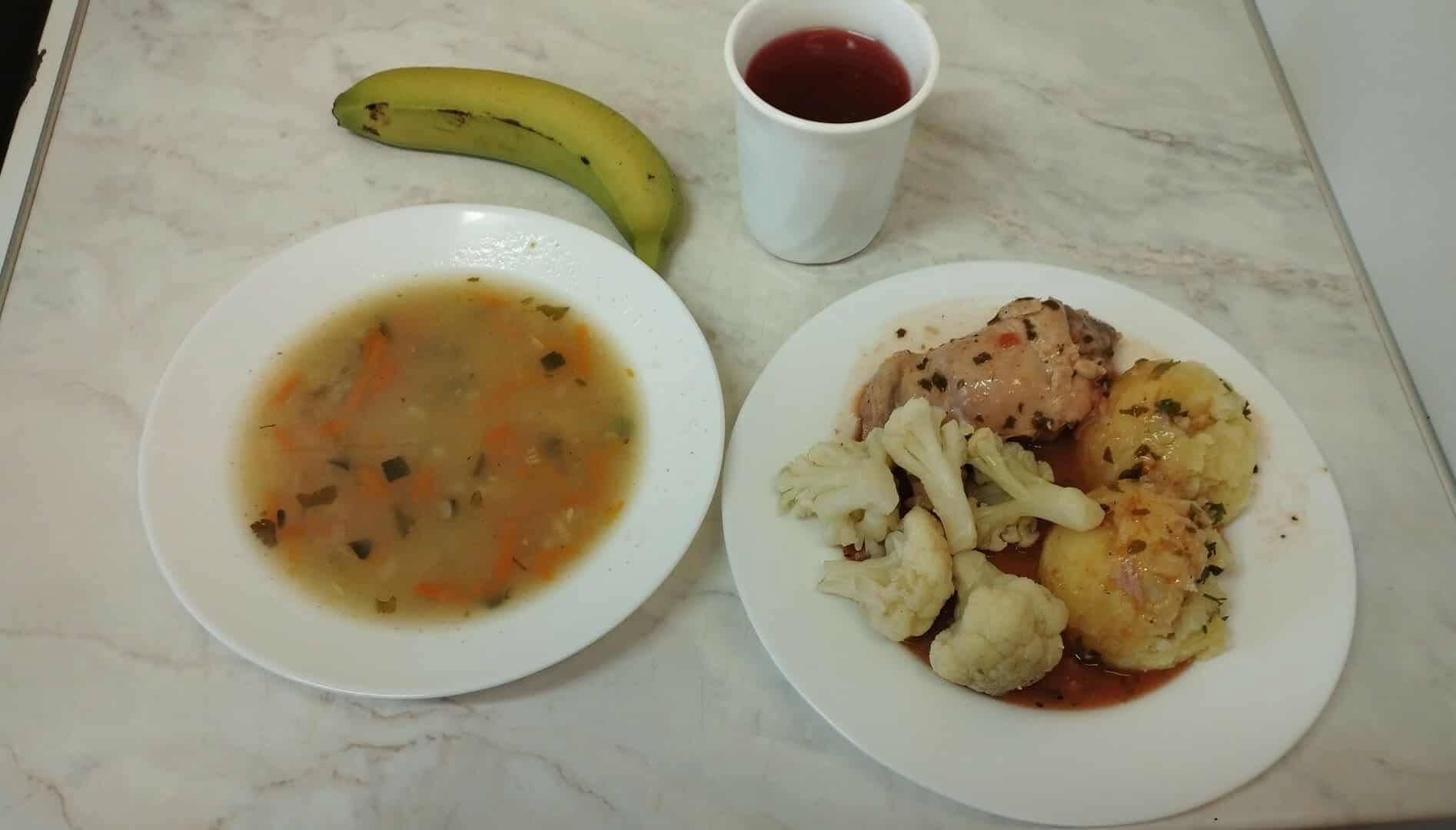 GRAMATURA: Zupa kalafiorowa z ryżem 350ml ( PSZENICA, SELER, SOJA), Wątróbka drobiowa w sosie własnym 200g (PSZENICA), Ziemniaki 150g , Surówka z kapusty białej z marchewką 150g , Kompot owocowy 250ml (S02)