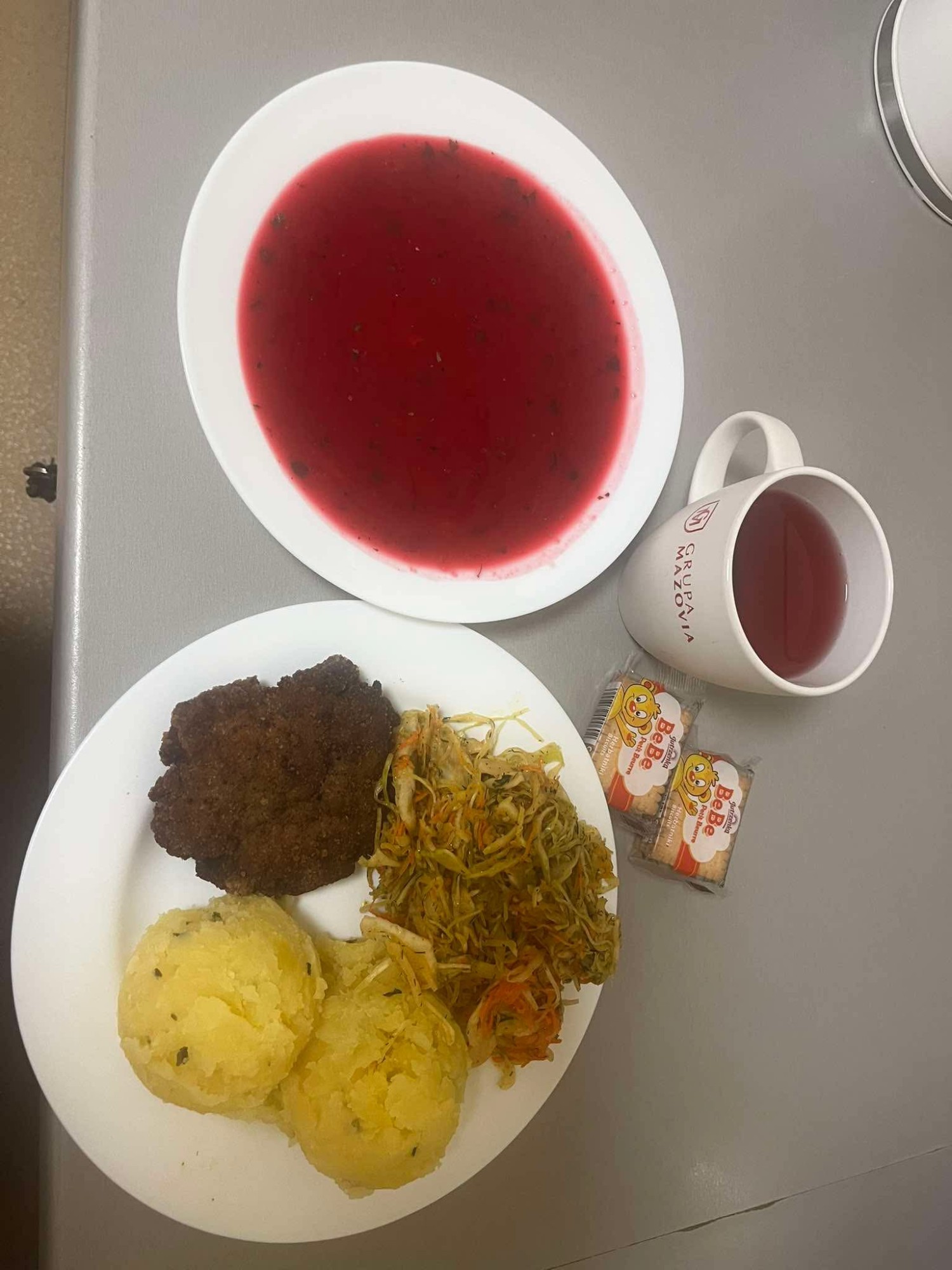 GRAMATURA: Barszcz czerwony z ziemniakami 350ml ( MLEKO, SELER, SOJA), Kotlet mielony wieprzowy - smażony 100g (JAJA, PSZENICA, SELER, GORCZYCA, SEZAM, ŁUBIN, ŻYTO ), Ziemniaki 200g , Surówka colesław 100g ( MLEKO), Kompot owocowy 250ml (S02), Podwieczorek: Herbatniki 1szt (GLUTEN, ORZECHY , ORZECHY AR, LAKTOZA)