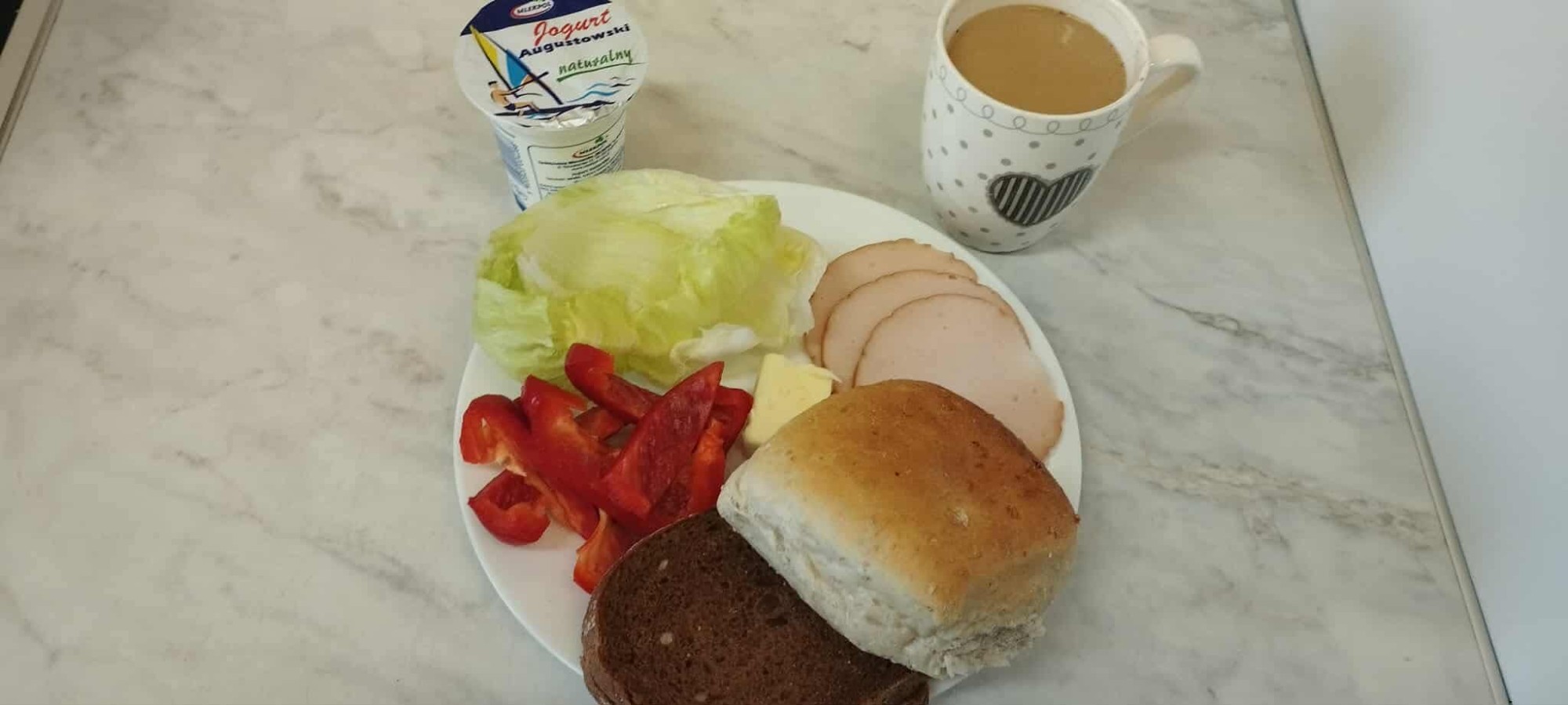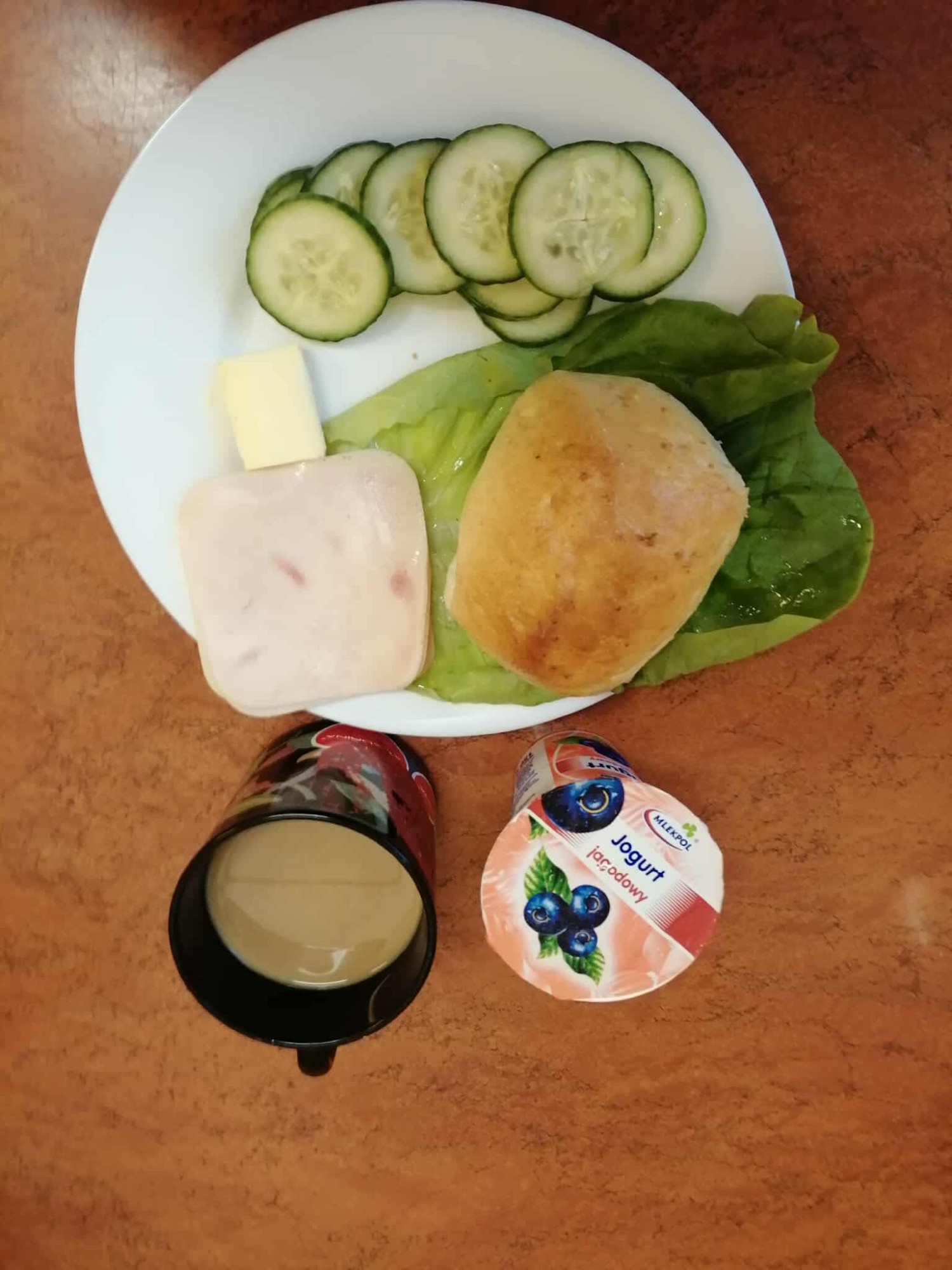 GRAMATURA: Pieczywo mieszane 100g (MLEKO, PSZENICA, ŻYTO, JĘCZMIEŃ), Masło extra 15g (ŚMIETANKA), Szynka drobiowa gotowana 50g (SELER, GORCZYCA), Ogórek kiszony 50g , Sałata masłowa 5g, Paparyka 20 g, Herbata 250ml , II Śniadanie: Jogurt naturalny 150g 1szt (MLEKO)