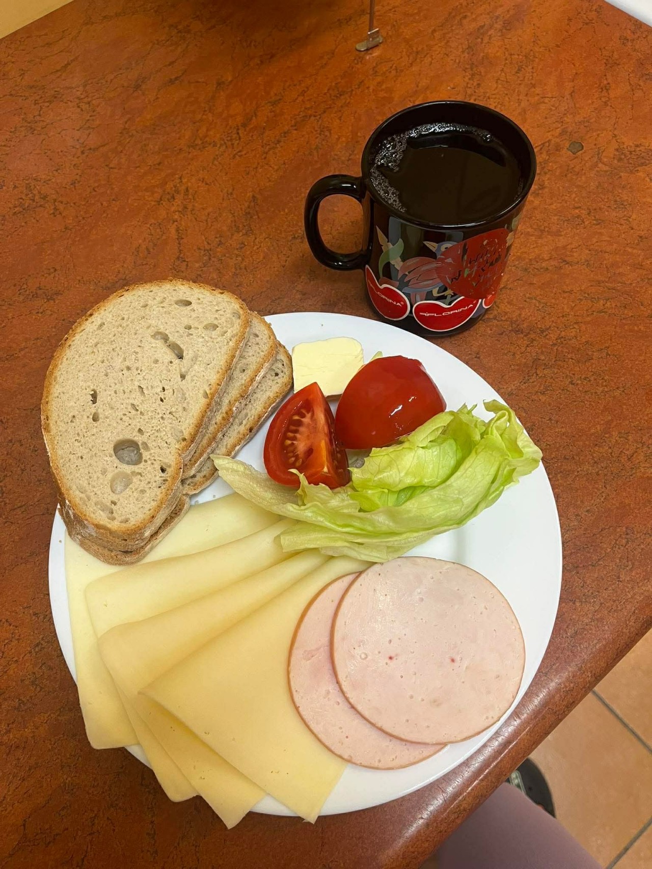 GRAMATURA: Wędlina - Schab ze spiżarni 20g ( GLUTEN, GORYCZYCA , SELER), Chleb zwykły 100g (PSZENICA, ŻYTO), Masło 15g (ŚMIETANKA), Ser żółty półtłusty 50g (MLEKO), Pomidor 50g , Sałata masłowa 5g , Herbata 250ml