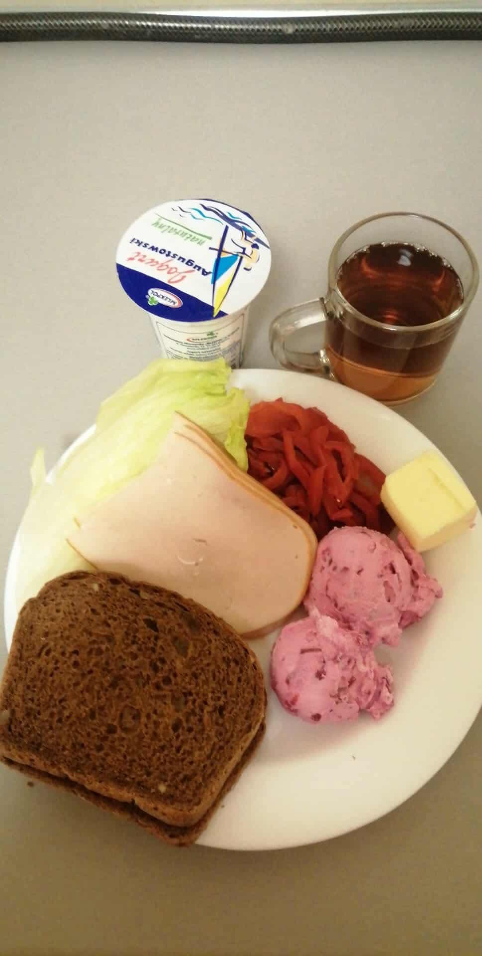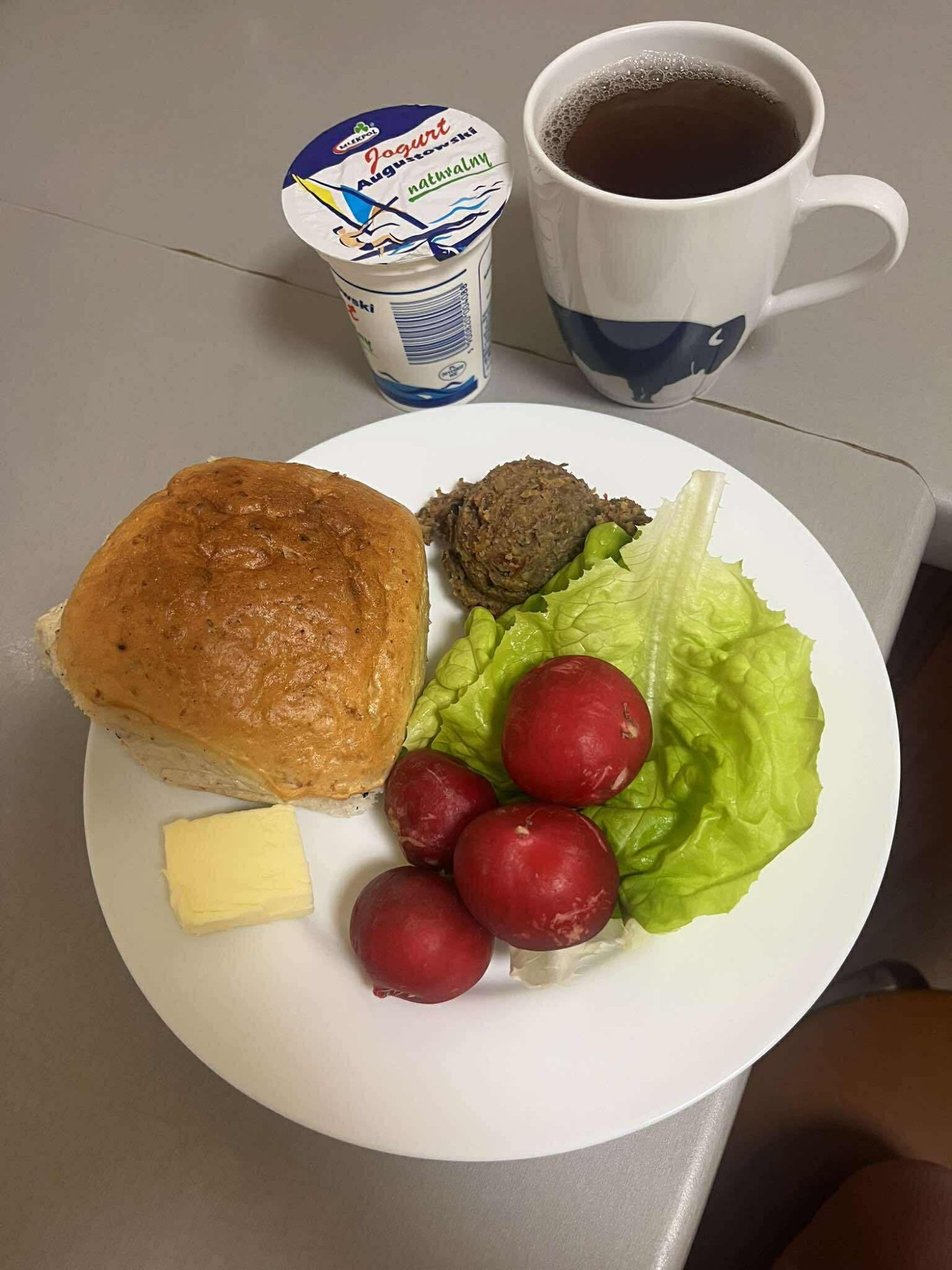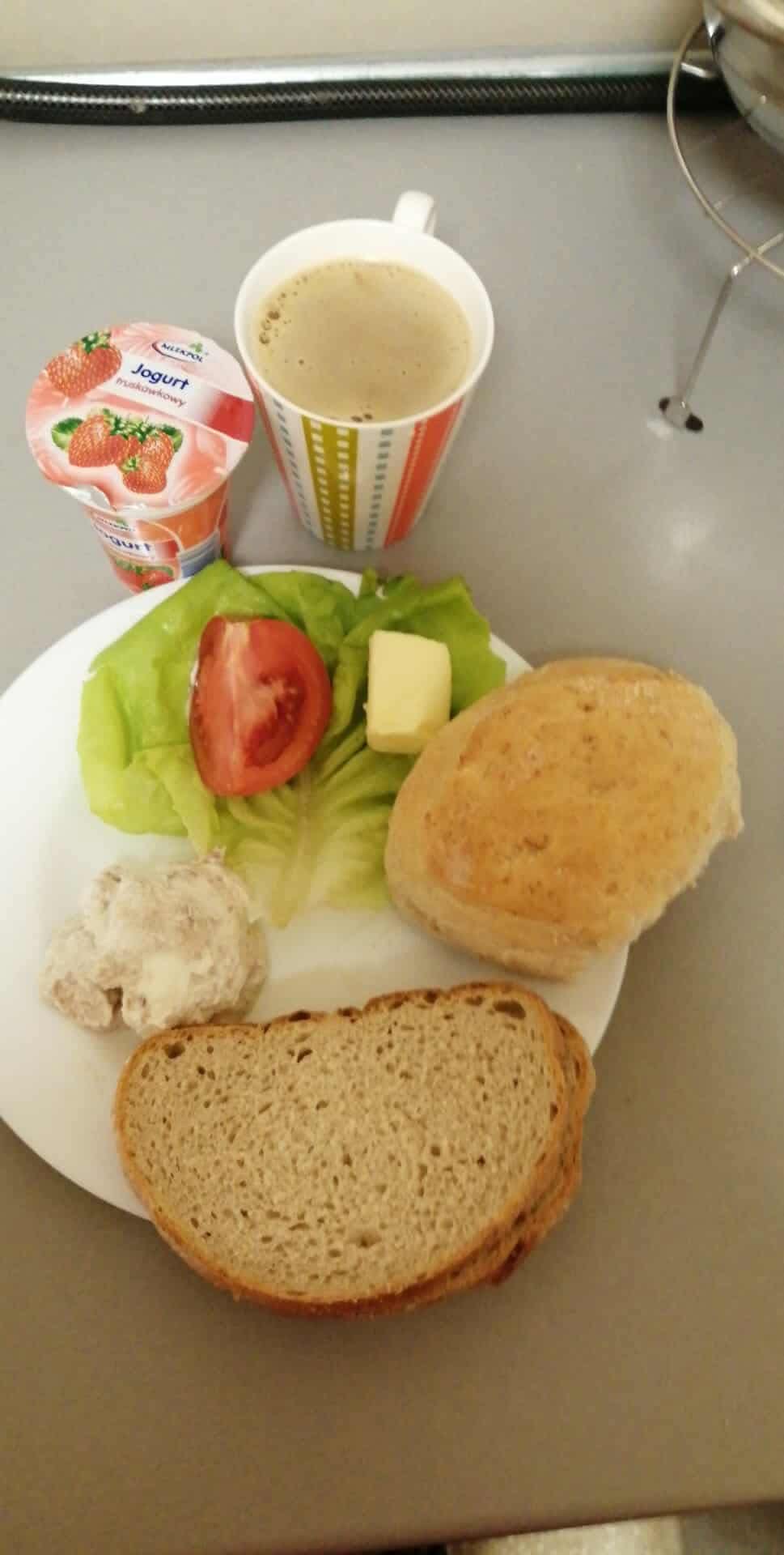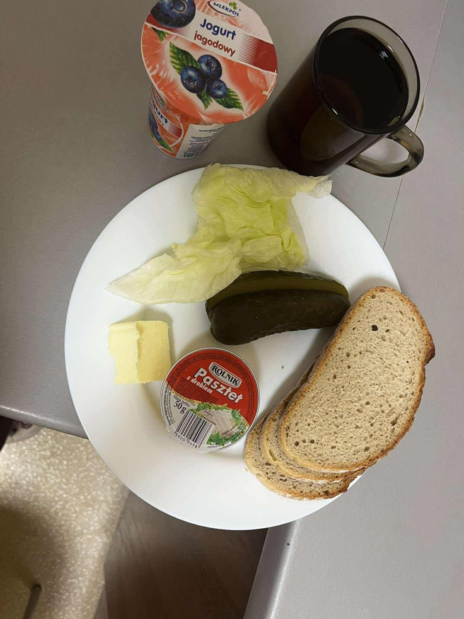 GRAMATURA: Pieczywo mieszane 100g (MLEKO, PSZENICA, ŻYTO, JĘCZMIEŃ), Masło extra 15g (ŚMIETANKA), Pasztet drobiowy 70g 1Por, Ogórek kiszony 50g , Herbata 250ml , Sałata masłowa 5g, II Śniadanie: Jogurt naturalny 150g 1szt (MLEKO)
