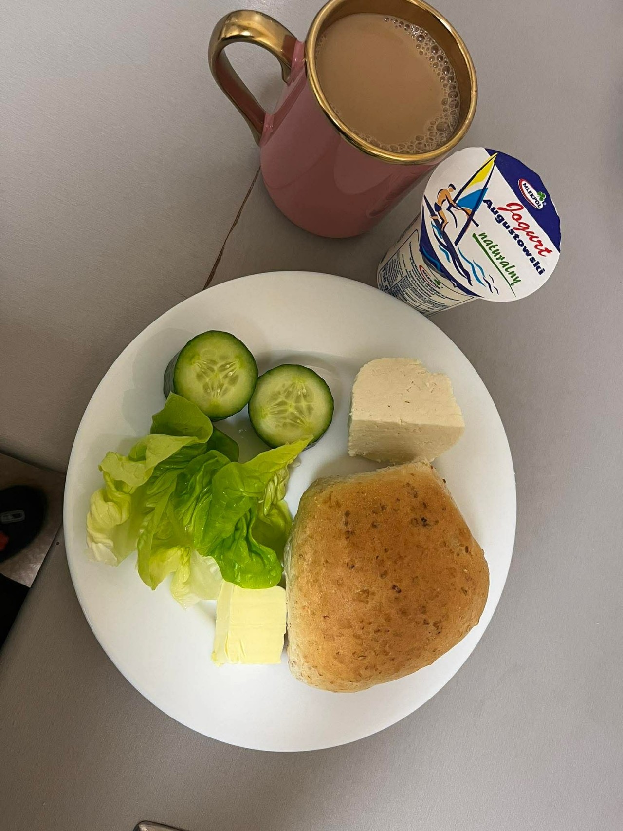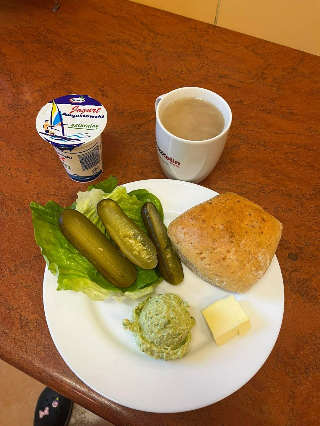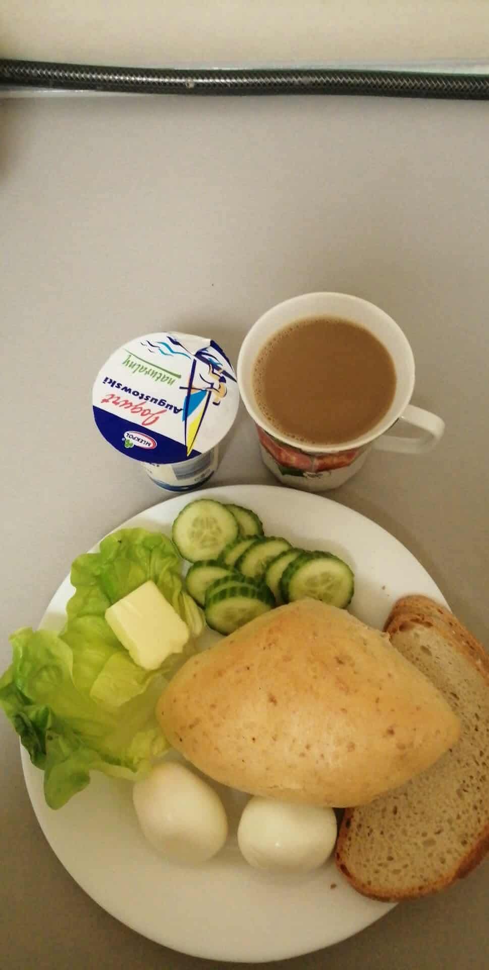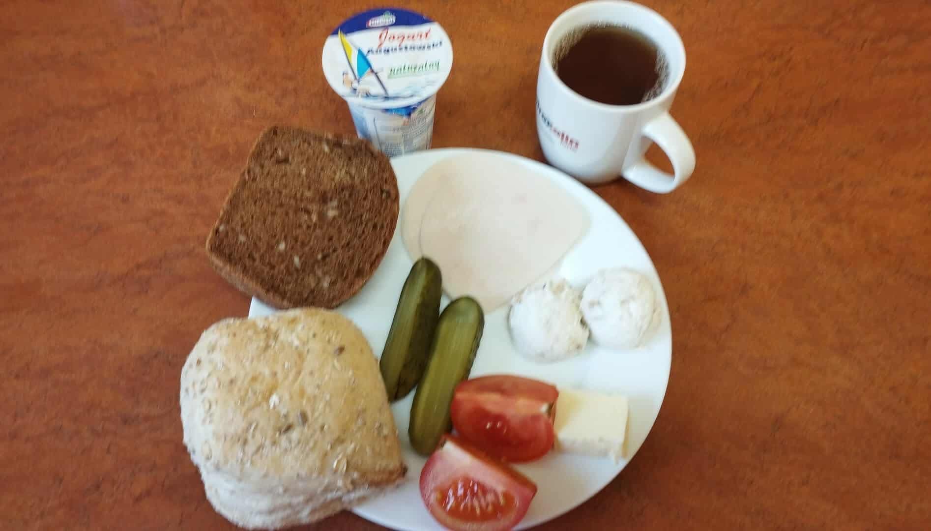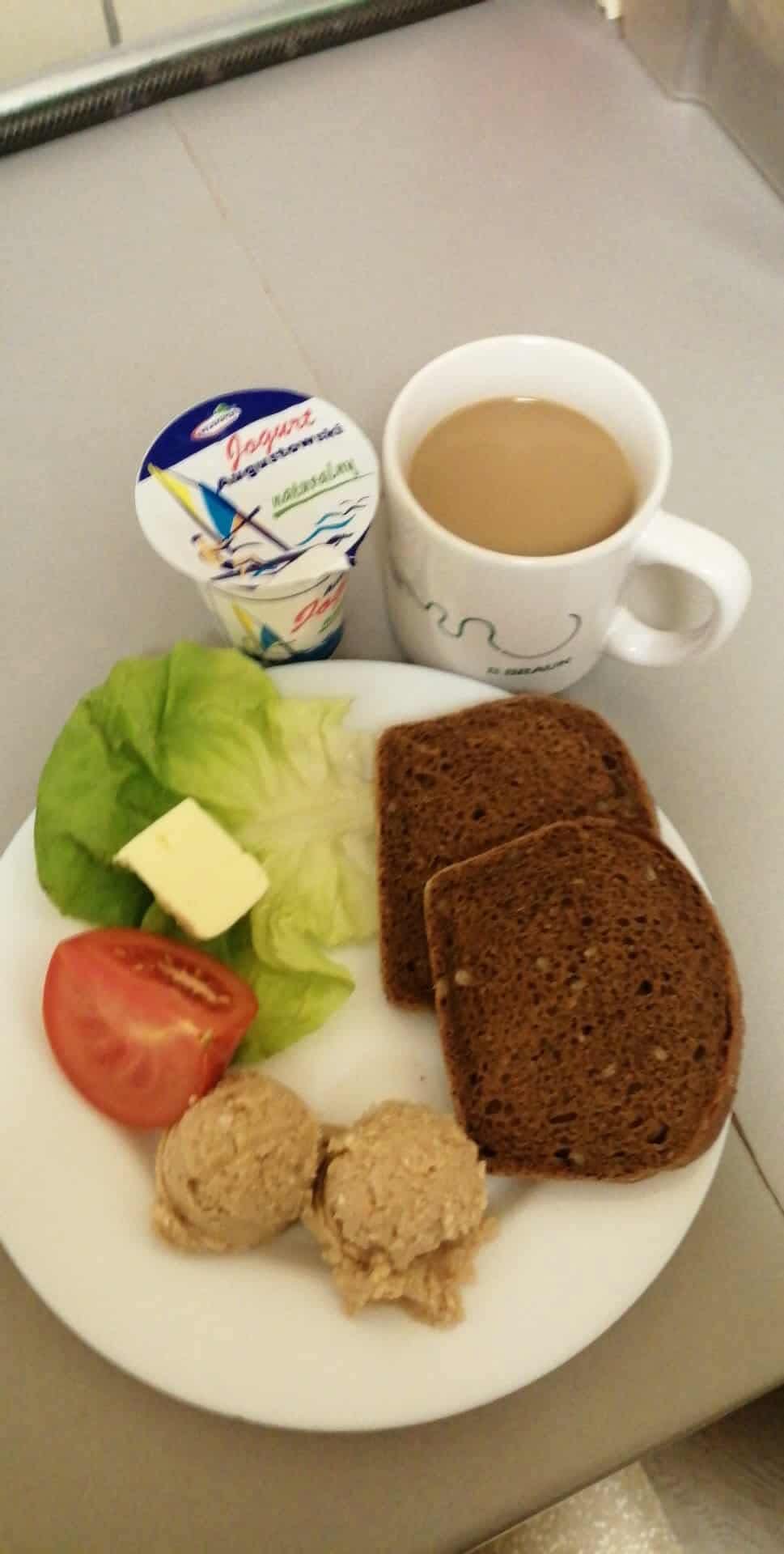 GRAMATURA: Pieczywo mieszane 100g (MLEKO, PSZENICA, ŻYTO, JĘCZMIEŃ), Masło extra 15g (ŚMIETANKA), Pasztet drobiowy 70g 1Por, Ogórek kiszony 50g , Herbata 250ml , Sałata masłowa 5g, II Śniadanie: Jogurt naturalny 150g 1szt (MLEKO)