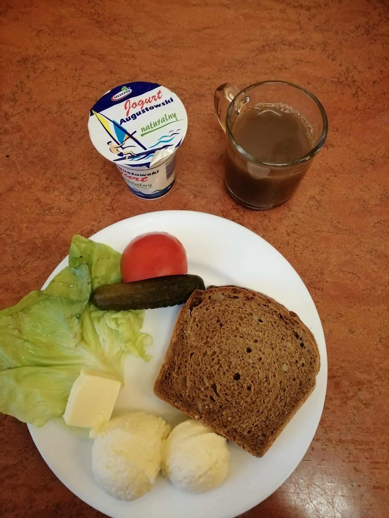 GRAMATURA: Chleb razowy 100g (MLEKO, JĘCZMIEŃ, PSZENICA, ŻYTO), Masło 15g (ŚMIETANKA), Twarożek 50g (MLEKO), Ogórek zielony 50g, Pomidor 30 g, Sałata masłowa 5g , Kawa zbożowa. 250g (MLEKO, JĘCZMIEŃ, ŻYTO), II Śniadanie: Jogurt naturalny 1szt (MLEKO)