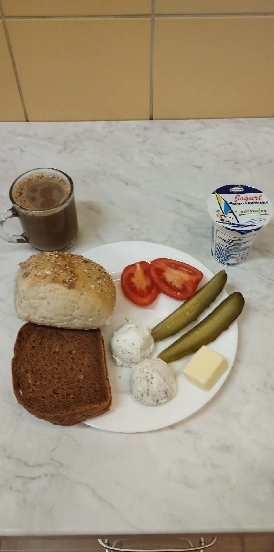 GRAMATURA: Chleb razowy 100g (MLEKO, JĘCZMIEŃ, PSZENICA, ŻYTO), Masło 15g (ŚMIETANKA), Pasta z tuńczyka z koperkiem 50g ( MLEKO), Pomidor 80g , Ogórek kiszony 30g , Kawa zbożowa bez cukru. 250g (MLEKO, JĘCZMIEŃ, ŻYTO), II Śniadanie: Jogurt naturalny 1szt (MLEKO)