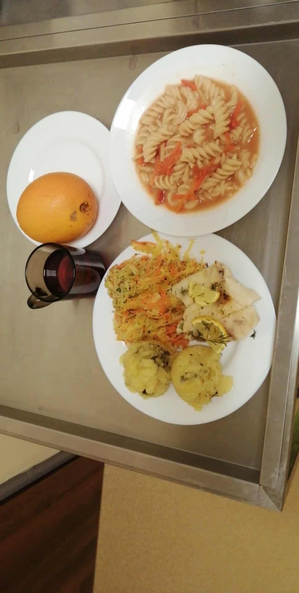 GRAMATURA: Krupnik z kaszą jaglaną i ziemniakami 350ml (MLEKO, S02, GLUTEN, GORYCZYCA , SOJA, SELER), Łazanki z kiełbasą i kapustą (makaron razowy) 300g (BIAŁKO JAJ, MLEKO, S02, GLUTEN, GORYCZYCA , JAJA, ORZECHY , SOJA, ŻYTO, SELER), Brokuły na parze 150g (SELER), Kompot owocowy 250ml, Podwieczorek: Mandarynka 150g