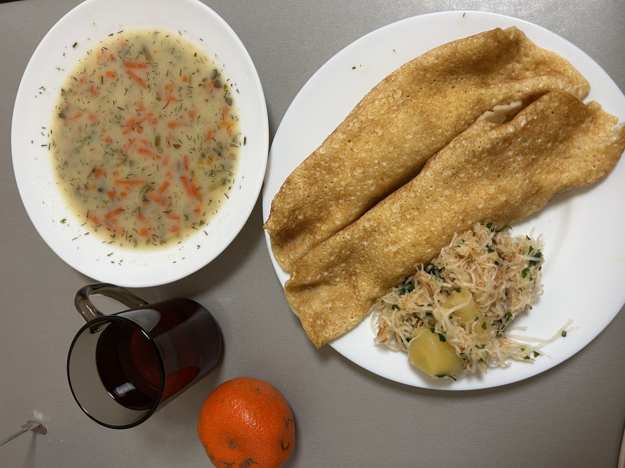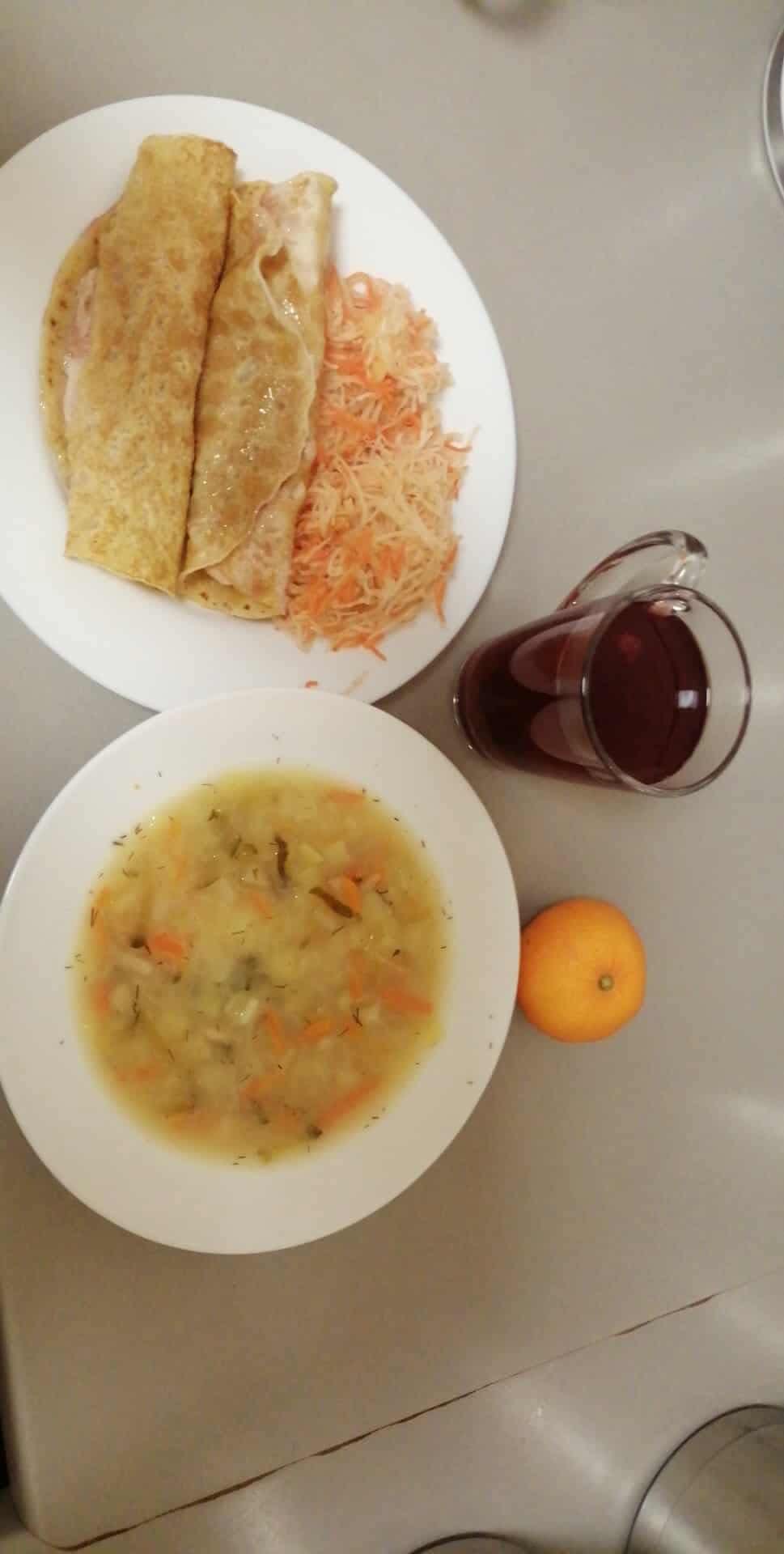 GRAMATURA: Zupa ogórkowa z ziemniakami 350ml ( PSZENICA, SELER, SOJA), Naleśniki z twarogiem i dżemem 2szt (GLUTEN), Surówka z selera i ananasa 150g (MLEKO, GLUTEN, JAJA), Kompot owocowy 250ml (S02), Podwieczorek: Mandarynka 150g