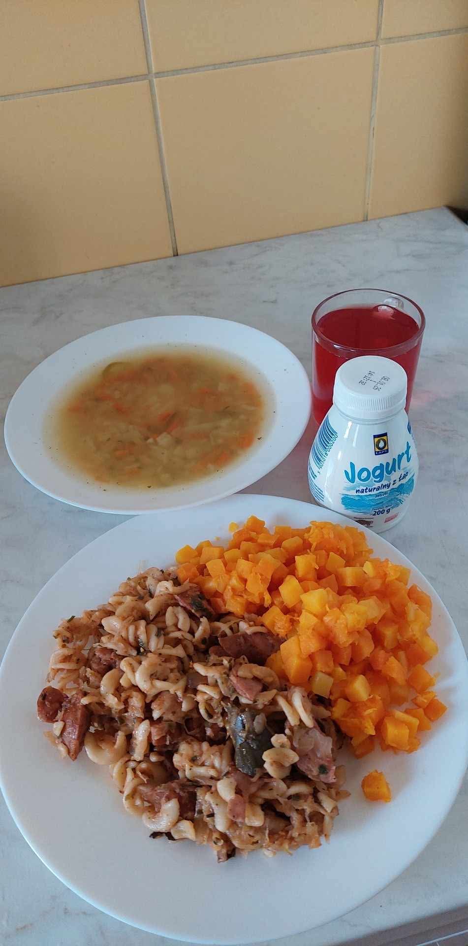 GRAMATURA: Zupa krupnik z kaszą jęczmienną i ziemniakami 350ml (MLEKO, S02, GLUTEN, GORYCZYCA , JĘCZMIEŃ, SOJA, SELER), Łazanki z kiełbasą i kapustą (makaron razowy) 300g ( BIAŁKO JAJ, MLEKO, S02, GLUTEN, GORYCZYCA , JAJA, ORZECHY , SOJA, ŻYTO, SELER ), Dynia kostka na parze 150g , Kompot owocowy 250ml ( MLEKO, S02, GLUTEN, GORYCZYCA , JAJA, ORZECHY , SOJA, SELER), Podwieczorek: Jogurt pitny naturalny 1szt (MLEKO)