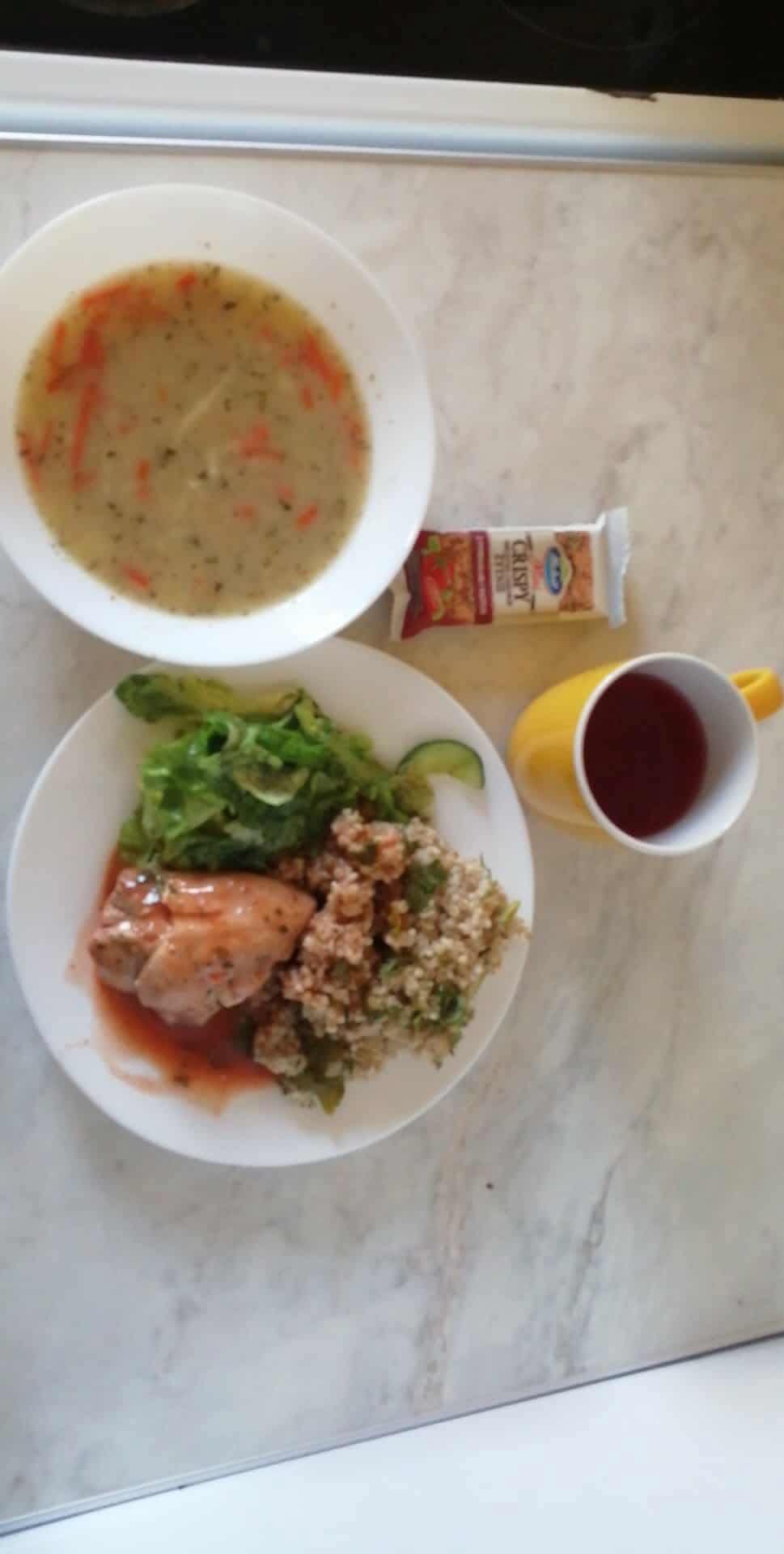 GRAMATURA: Zupa groszkowa z ryżem 350ml ( PSZENICA, SELER, OWIES), Filet z kurczaka w sosie z rozmarynem 100g (GLUTEN, SELER, GORCZYCA, SEZAM), Kasza jęczmienna 200g (JĘCZMIEŃ), Sałata lodowa z sosem vinegret 100g ( GLUTEN, ORZ. LASKO, ORZECHY AR, SOJA, GORCZYCA, SEZAM), Kompot owocowy 250ml (S02)