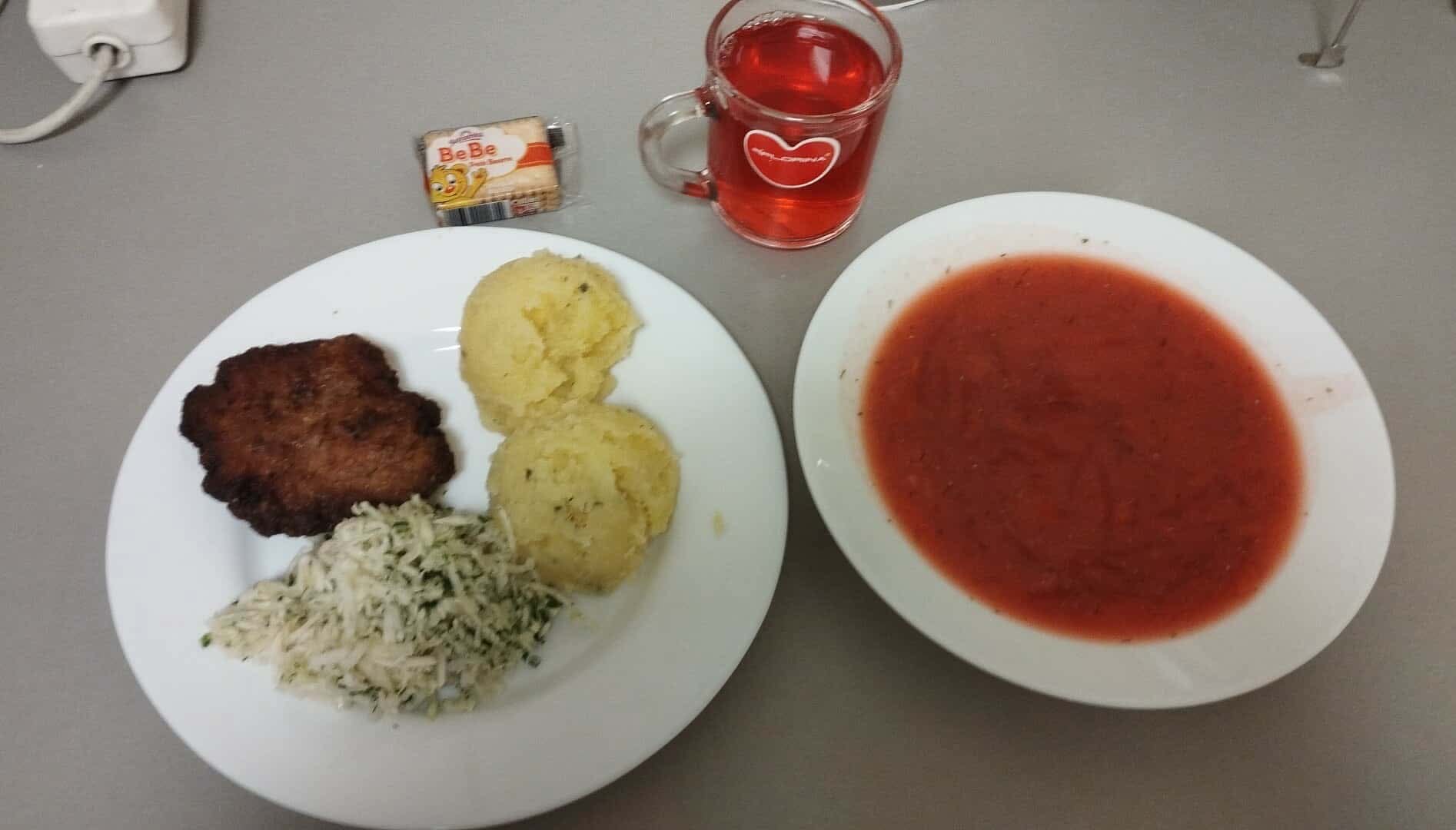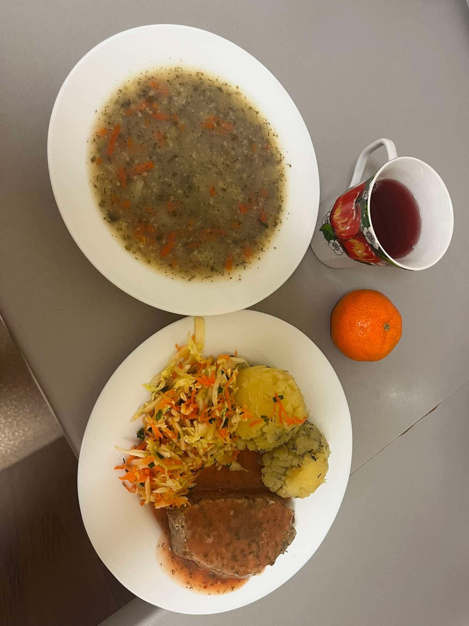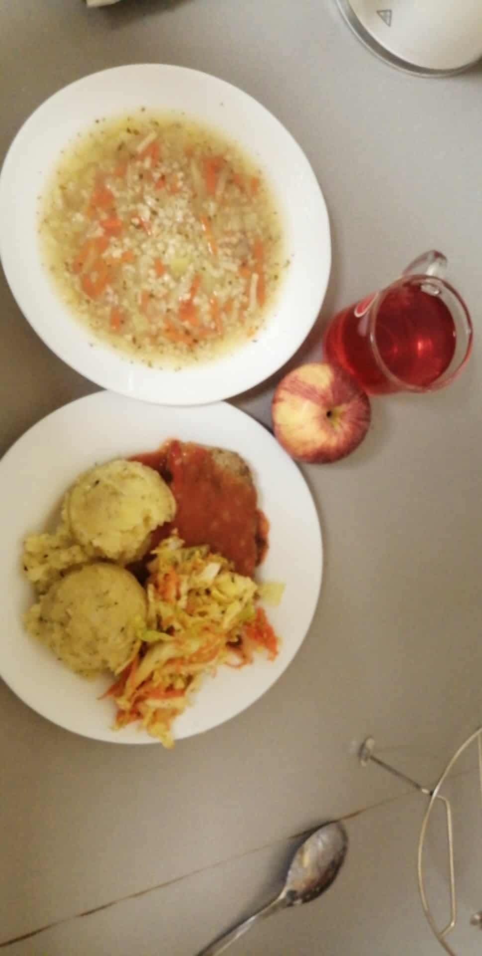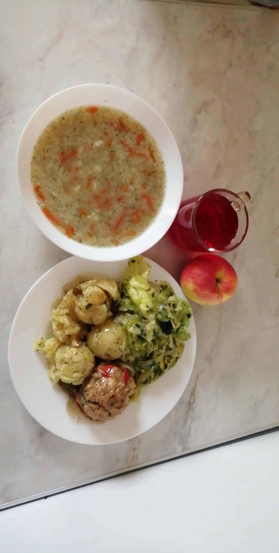 GRAMATURA: Krupnik z kaszą jęczmienną 350ml ( SELER, SOJA, JĘCZMIEŃ), Pieczeń rzymska 100g (MLEKO, JAJA, PSZENICA, SELER, GORCZYCA, SEZAM, ŁUBIN, ŻYTO), Sos pomidorowy 100ml (PSZENICA, SELER), Ziemniaki 200g , Surówka z kapusty pekińskiej z marchewką 100g , Kompot owocowy 250ml (S02)