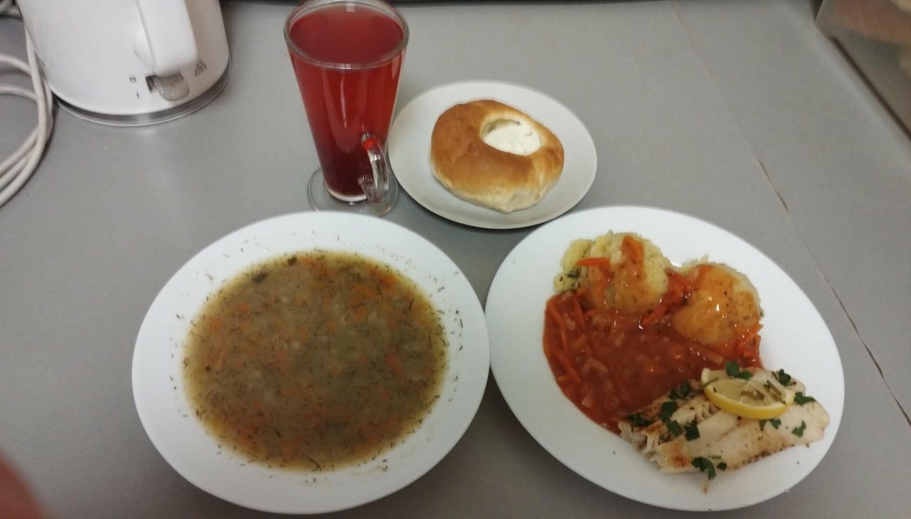 GRAMATURA: Zupa szczawiowa z ziemniakami 350ml (PSZENICA, SELER, SOJA), Filet z miruny pieczony z cytryną 100g (GORCZYCA, SEZAM, ŁUBIN), Ziemniaki 200g , Warzywa po grecku 100g (SELER), Surówka z kapusty kiszonej i marchewki 100g Kompot owocowy 250ml (S02), Podwieczorek: Drożdżówka 1szt (MLEKO, GLUTEN, JAJA, SEZAM, ŻYTO)