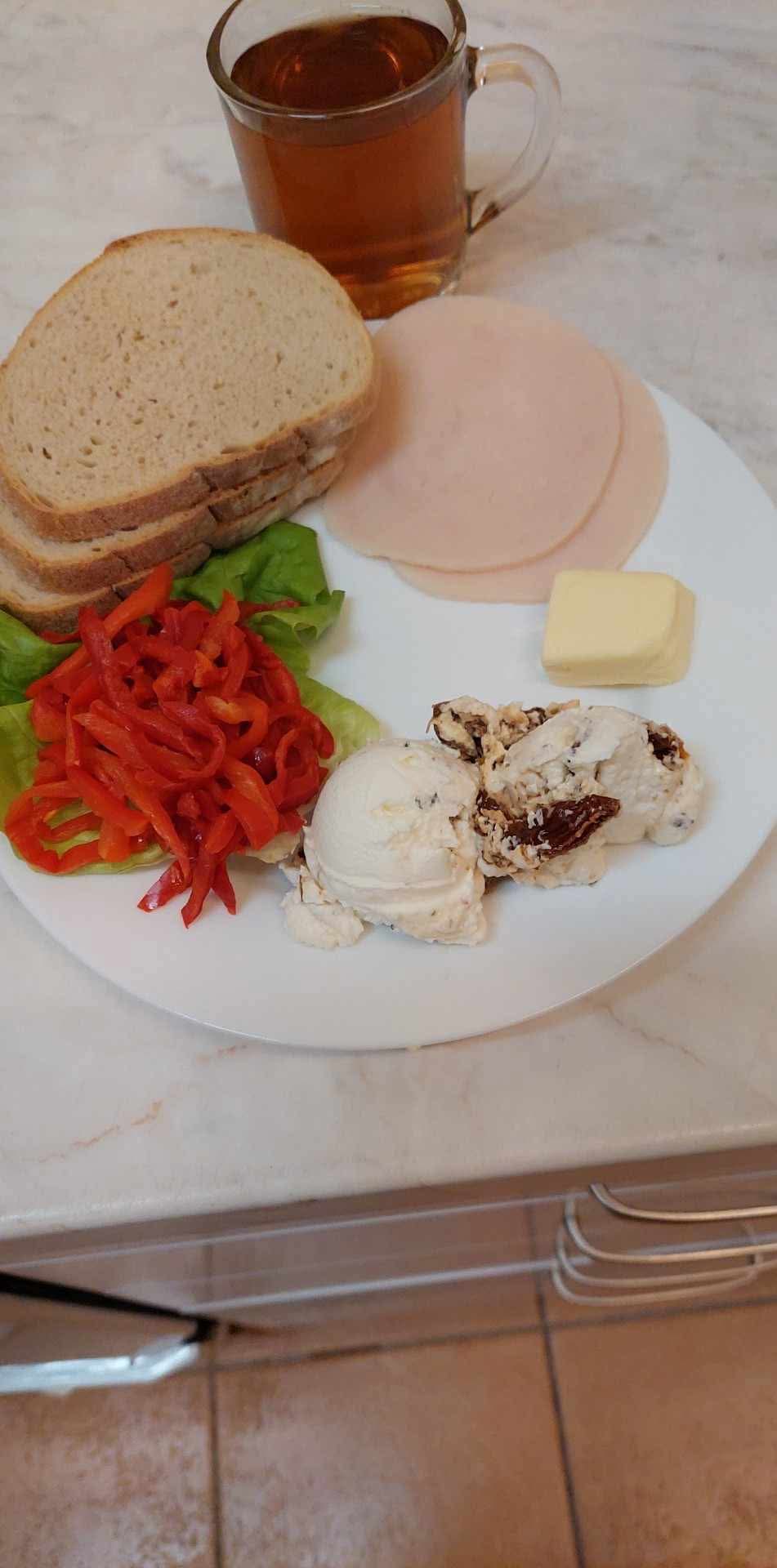 GRAMATURA: Chleb zwykły 100g (PSZENICA, ŻYTO), Masło 15g (ŚMIETANKA), Polędwica premium 20g (MLEKO, PSZENICA, SOJA ), Twarożek z pomidorami suszonymi 50g (MLEKO), Papryka konserwowa 50g (S02), Sałata masłowa 5g , Herbata 250ml