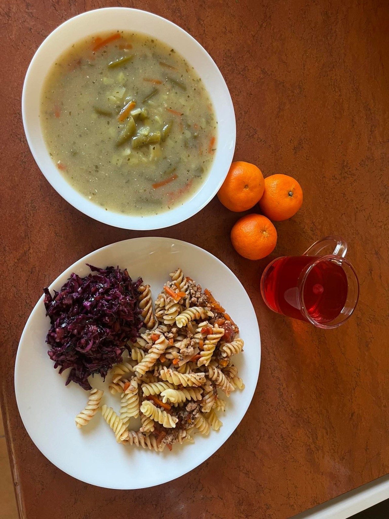 GRAMATURA: Zupa z fasolką szparagową i ziemniakami 350ml(MLEKO, S02, GLUTEN, GORYCZYCA , PSZENICA, SOJA, SELER), Makaron razowy z sosem bolońskim 350g (MLEKO, S02, GLUTEN, GORYCZYCA , JAJA, ŁUBIN, ORZECHY AR, SOJA, SELER, SEZAM), Surówka z kapusty czerwonej z jabłkiem 100g , Kompot owocowy 250ml (MLEKO, S02, GLUTEN, GORYCZYCA , JAJA, ORZECHY , SOJA, SELER ), Podwieczorek: Mandarynka 150g