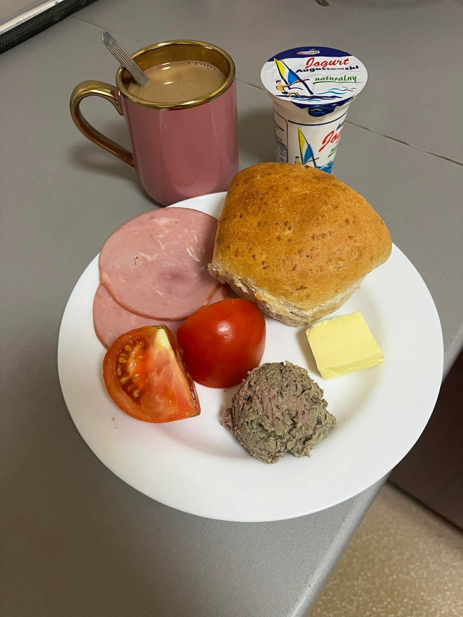 GRAMATURA: Chleb razowy 100g (MLEKO, PSZENICA, ŻYTO, JĘCZMIEŃ), Masło 15g (ŚMIETANKA), Szynka piastowska 50g, Pasta z wątróbki 50g, Pomidor 120 g , Kawa zbożowa. 250g (MLEKO, ŻYTO, JĘCZMIEŃ), II Śniadanie: Jogurt naturalny 1szt (MLEKO)