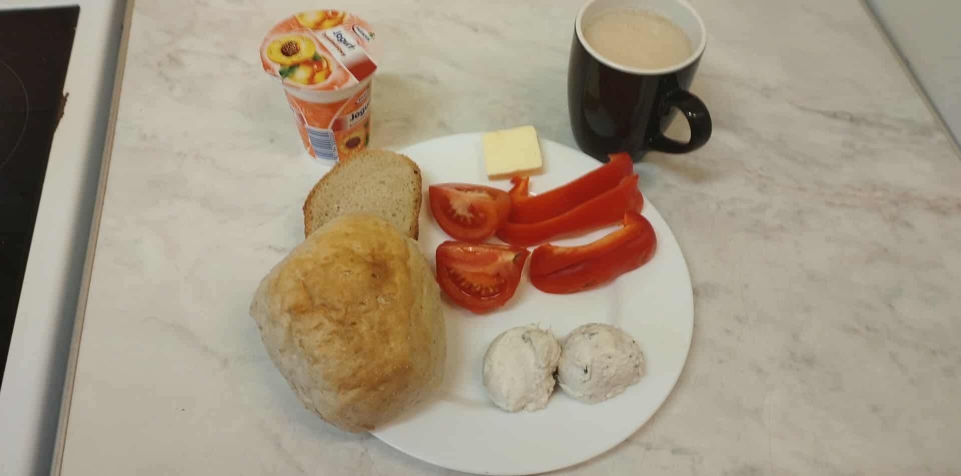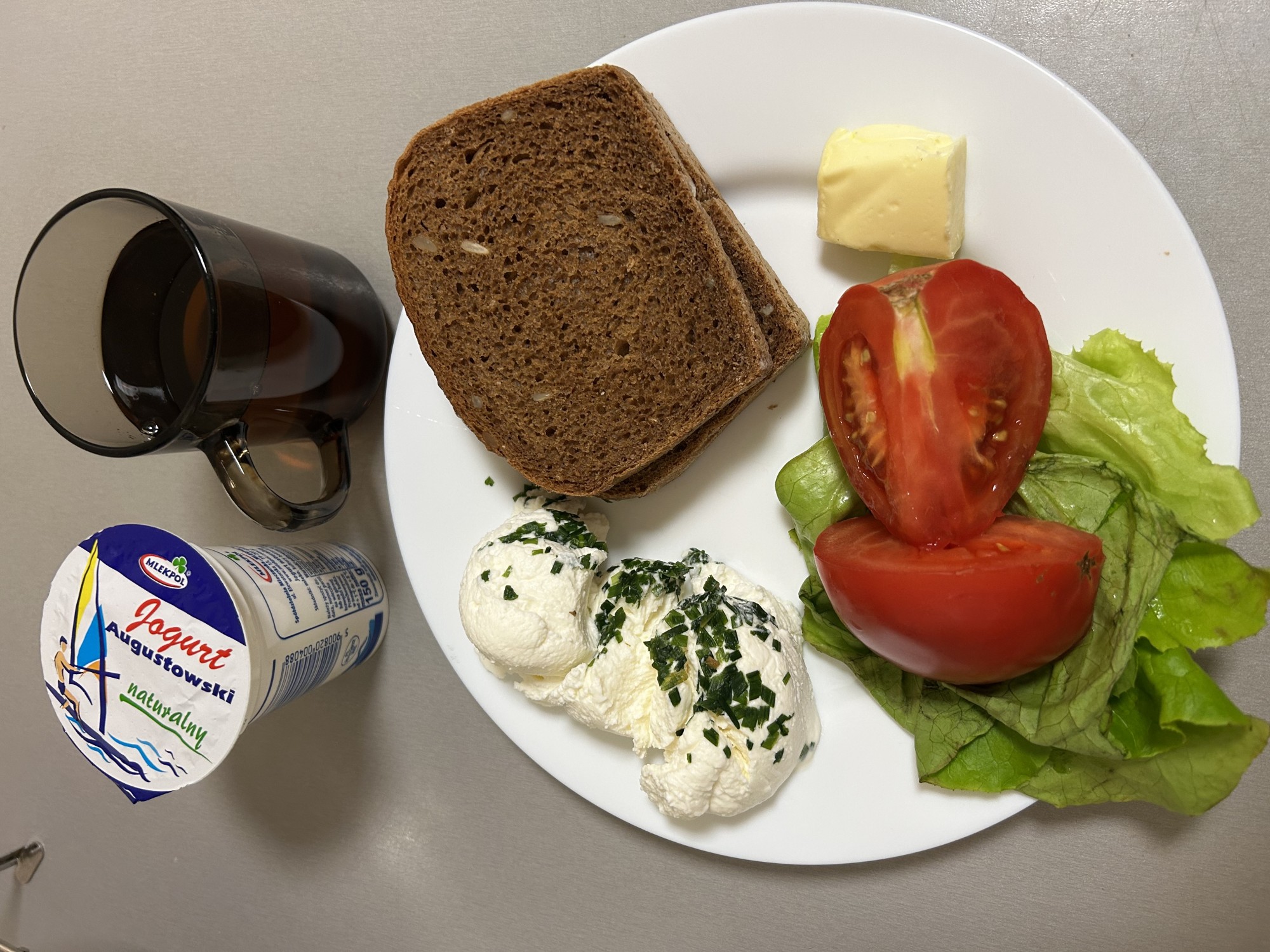 GRAMATURA: Chleb razowy 50g (MLEKO, PSZENICA, ŻYTO, JĘCZMIEŃ), Bułka grahamka 1szt (PSZENICA, ŻYTO), Masło 15g (ŚMIETANKA), Twarożek ze szczypiorkiem 50g (MLEKO), Pomidor 50g , Sałata masłowa 5g , Herbata 250ml , II Śniadanie: Jogurt naturalny 1szt (MLEKO)