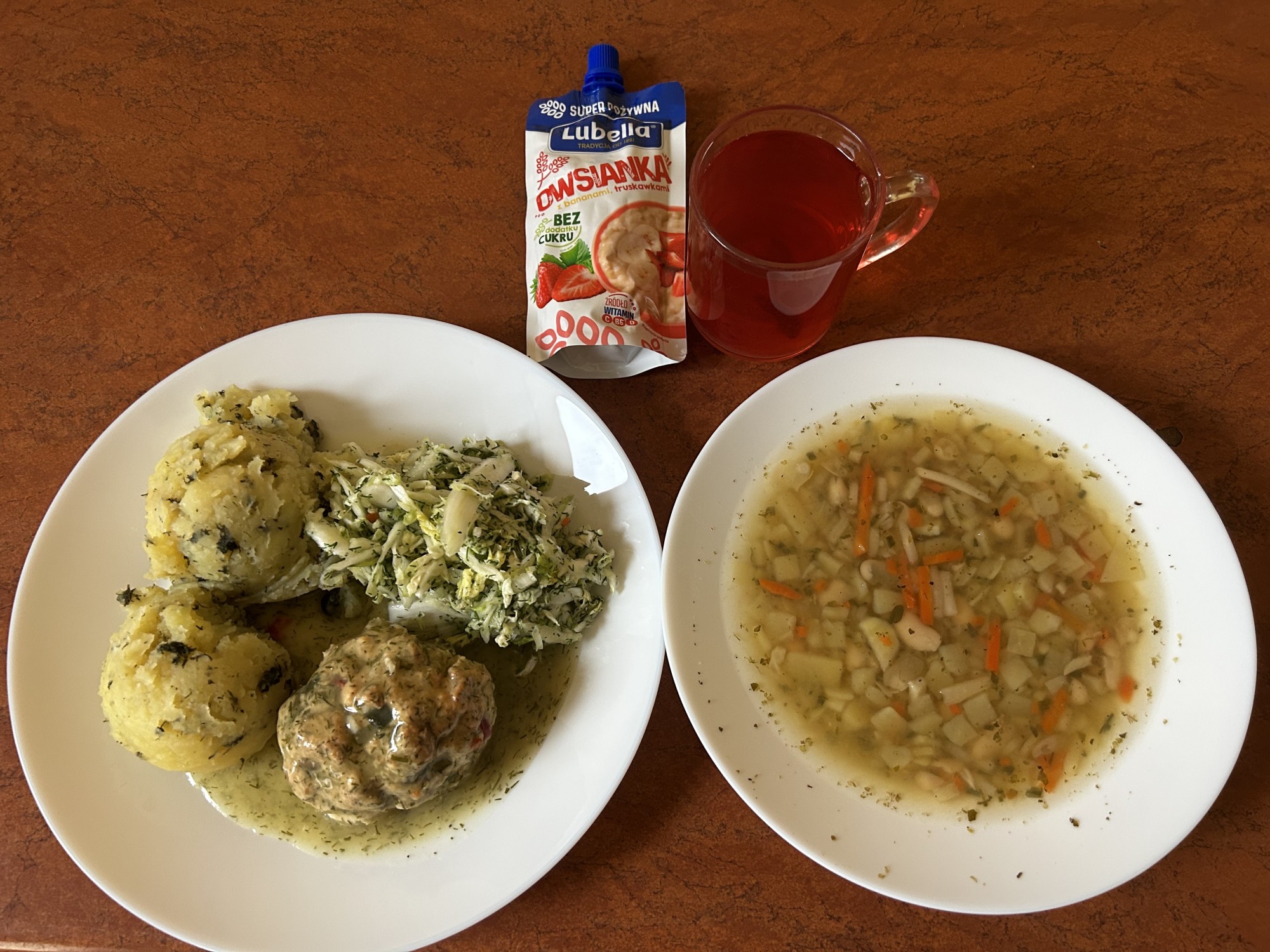 GRAMATURA: Zupa fasolowa z ziemniakami 350ml ( BIAŁKO JAJ, MLEKO, S02, GLUTEN, GORYCZYCA , JAJA, ORZECHY , OWIES, PSZENICA, SOJA, ŻYTO, SELER), Pyzy z mięsem z masłem 300g (ŚMIETANKA), Marchewka z groszkiem 150g (OWIES, SELER), Kompot owocowy 250ml Podwieczorek: Owsianka w tubce 1szt (MLEKO, GLUTEN)