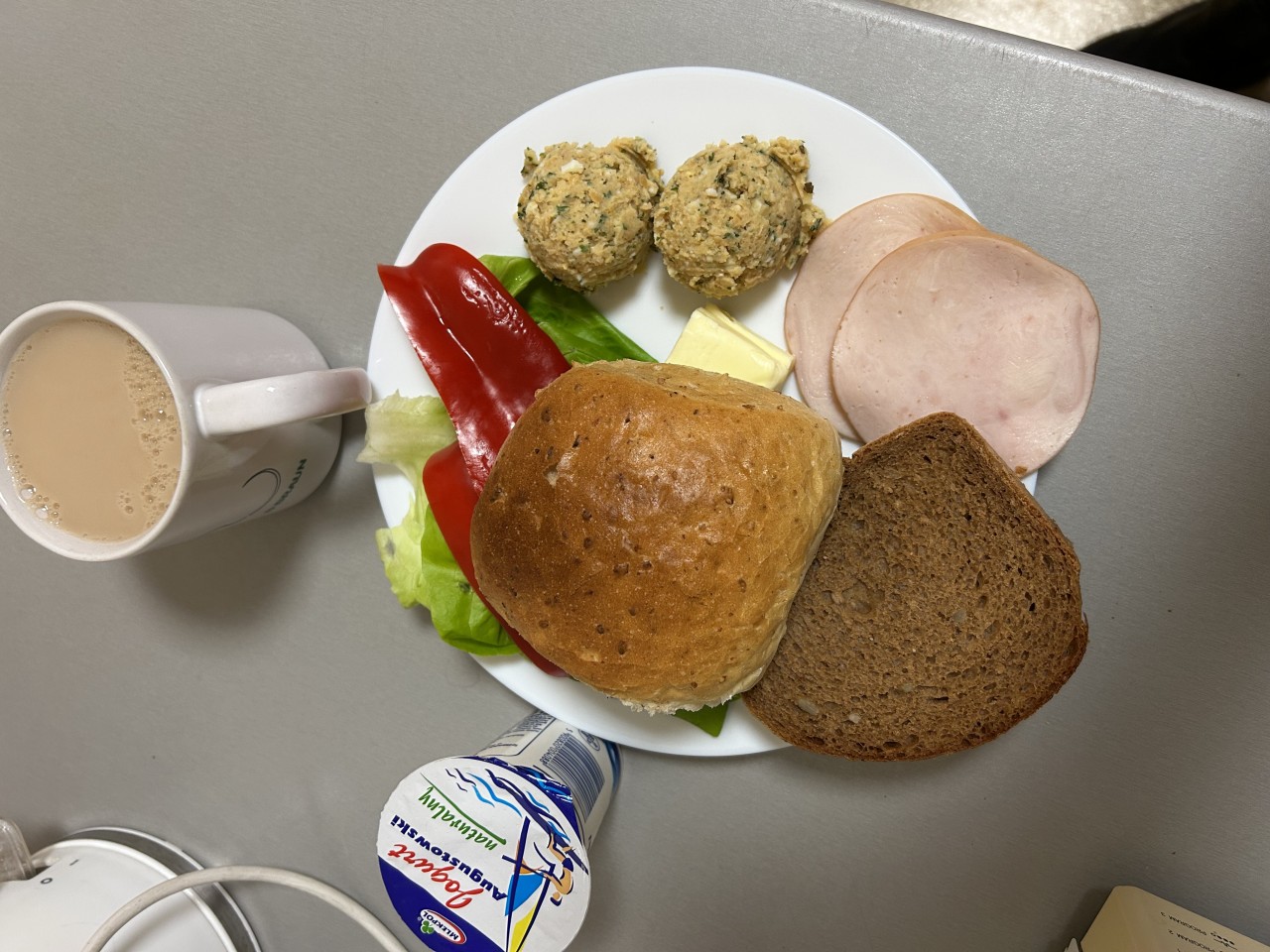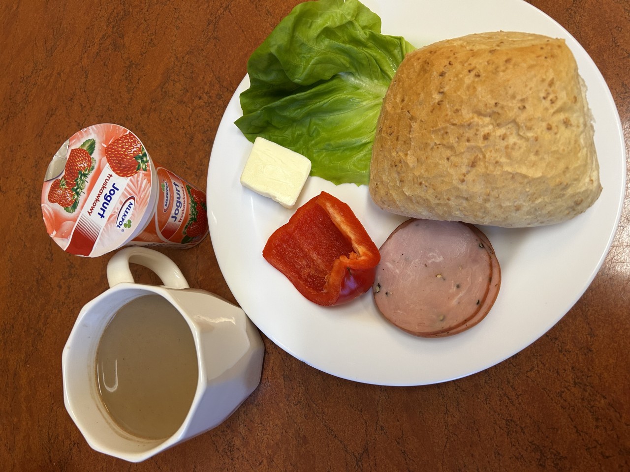 Polędwica premium 20g , Pieczywo mieszane, 100g (MLEKO, PSZENICA, ŻYTO, JĘCZMIEŃ), Masło extra 15g (ŚMIETANKA), Ser żółty półtłusty 50g (MLEKO), Papryka czerwona 50g , Sałata masłowa 5g , Herbata 250ml,Drożdżówka z serem 1szt (MLEKO, GLUTEN, JAJA, SEZAM, ŻYTO)