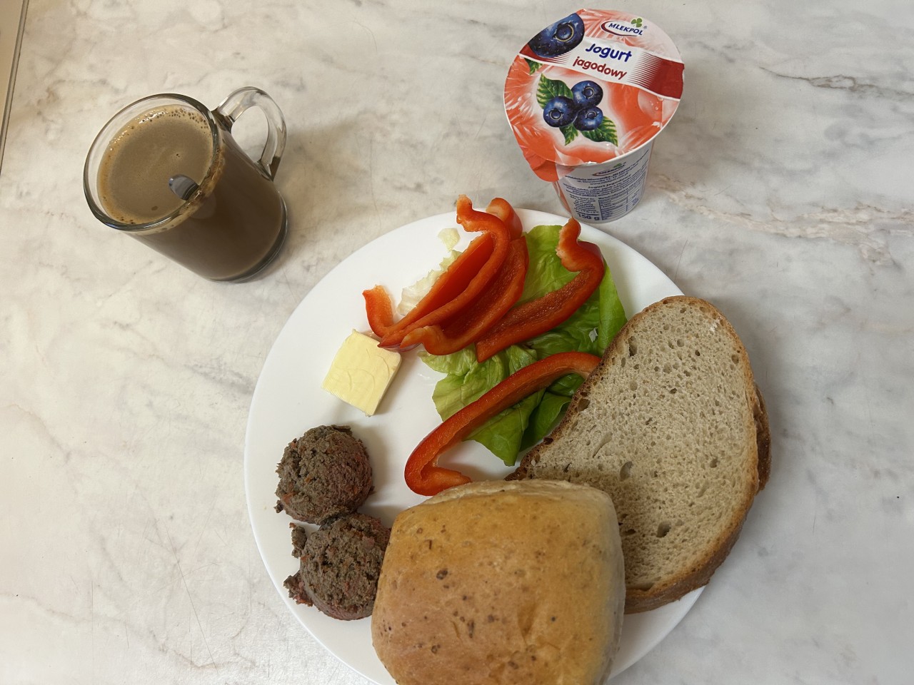 GRAMATURA: Chleb zwykły 100g (PSZENICA, ŻYTO), Masło 15g (ŚMIETANKA), Pasta z wątróbki 50g (MLEKO, S02, GLUTEN, GORYCZYCA , SOJA, SELER), Papryka 50g , Kawa zbożowa. 250g (MLEKO, JĘCZMIEŃ, ŻYTO ), Sałata masłowa 5g , II Śniadanie: Jogurt owocowy 1szt (MLEKO)