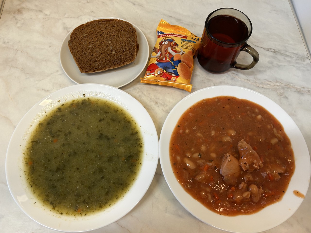 GRAMATURA: Zupa szpinakowa z ziemniakami 350ml ( MLEKO, S02, GLUTEN, GORYCZYCA , PSZENICA, SOJA, SELER), Fasolka po bretońsku lekka z mięsem drobiowym 350g (MLEKO, S02, GLUTEN, GORYCZYCA , JAJA, ORZECHY , OWIES, SOJA, ŻYTO, SELER), Chleb żytni (PSZENICA, ŻYTO), Kompot owocowy 250ml (MLEKO, S02, GLUTEN, GORYCZYCA , JAJA, ORZECHY , SOJA, SELER), Podwieczorek: Biszkopty bez cukru 1szt (GLUTEN, JAJA)