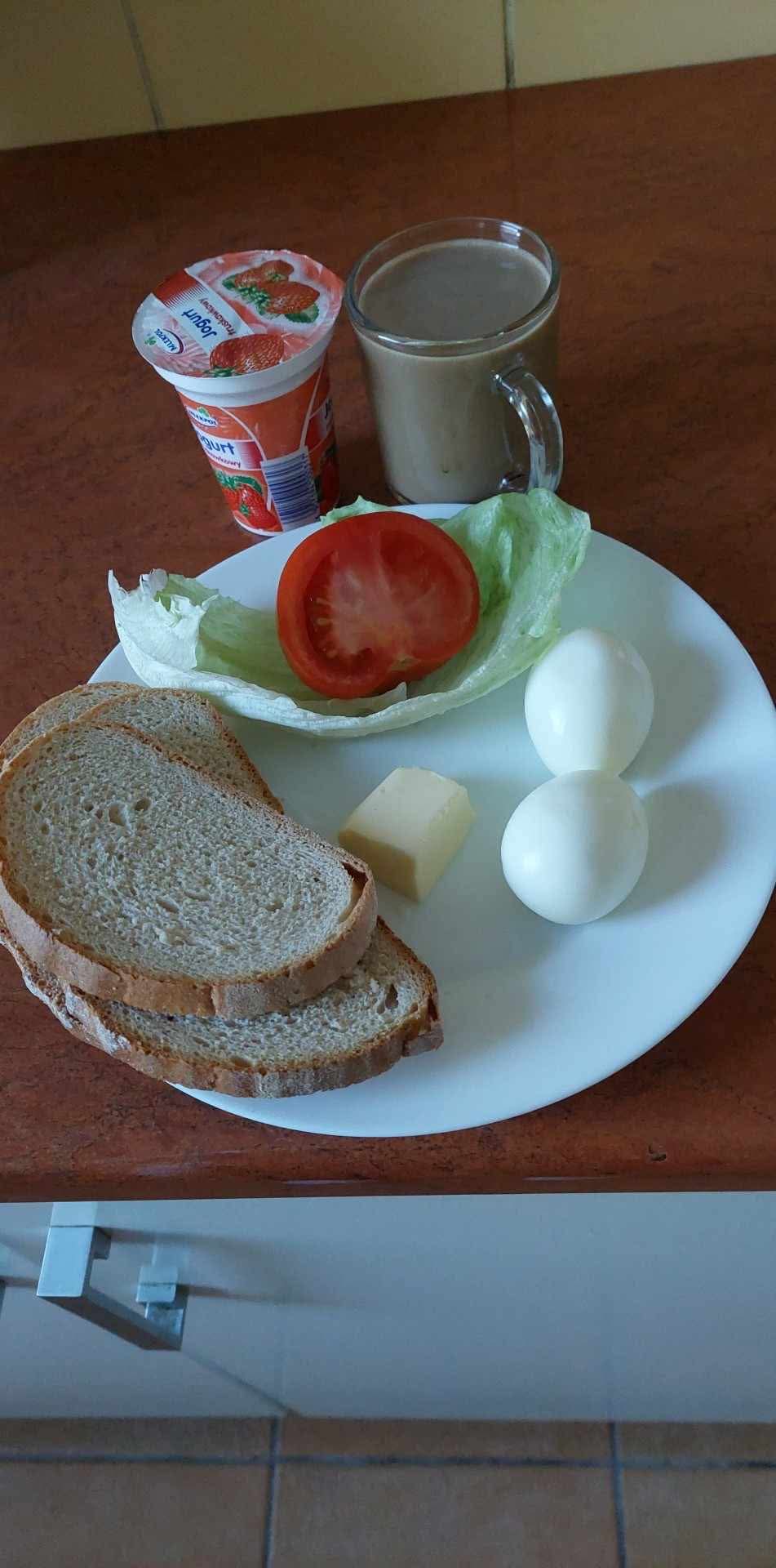 GRAMATURA: Chleb zwykły 100g (PSZENICA, ŻYTO), Masło 15g (ŚMIETANKA), Jajko gotowane kl. L 2szt (JAJA), Pomidor 50g , Kawa zbożowa. 250g (MLEKO, JĘCZMIEŃ, ŻYTO ), Sałata masłowa 5g , II Śniadanie: Jogurt owocowy 1szt (MLEKO)