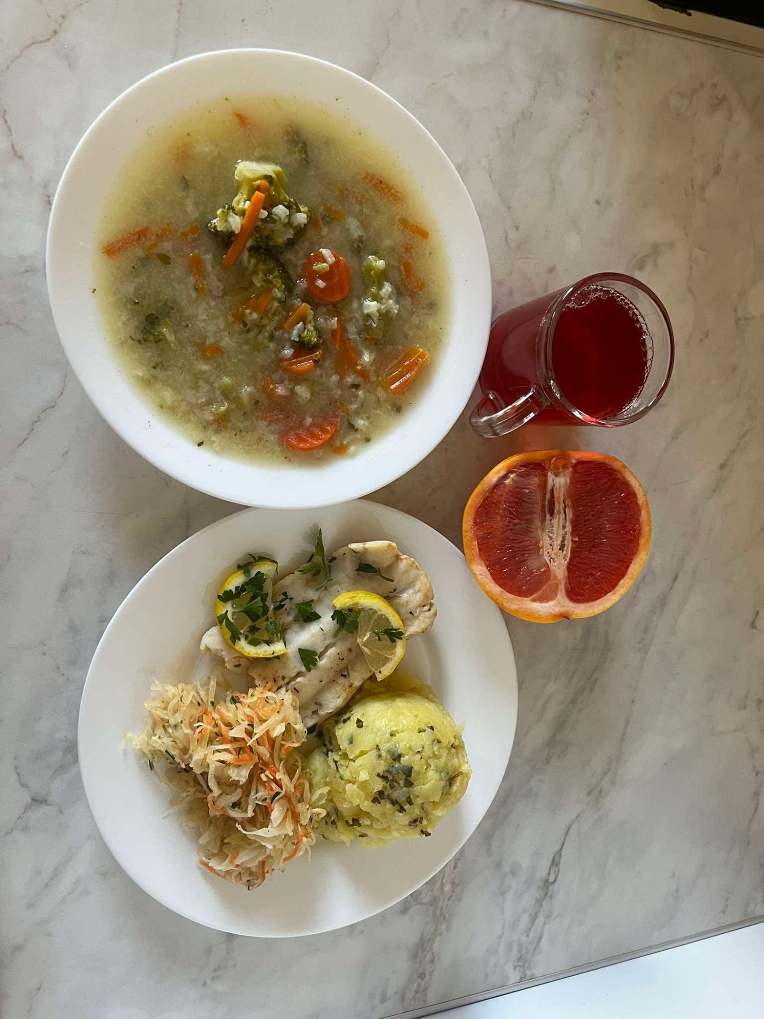 GRAMATURA: Zupa brokułowa z ryżem 350ml ( PSZENICA, SELER, SOJA), Filet z miruny na parze z cyrtyną 100g (GORCZYCA, SEZAM, ŁUBIN ), Ziemniaki 200g , Surówka z kapusty kiszonej i marchewki 100g , Kompot owocowy 250ml ( S02), Podwieczorek: Grejpfrut 150g