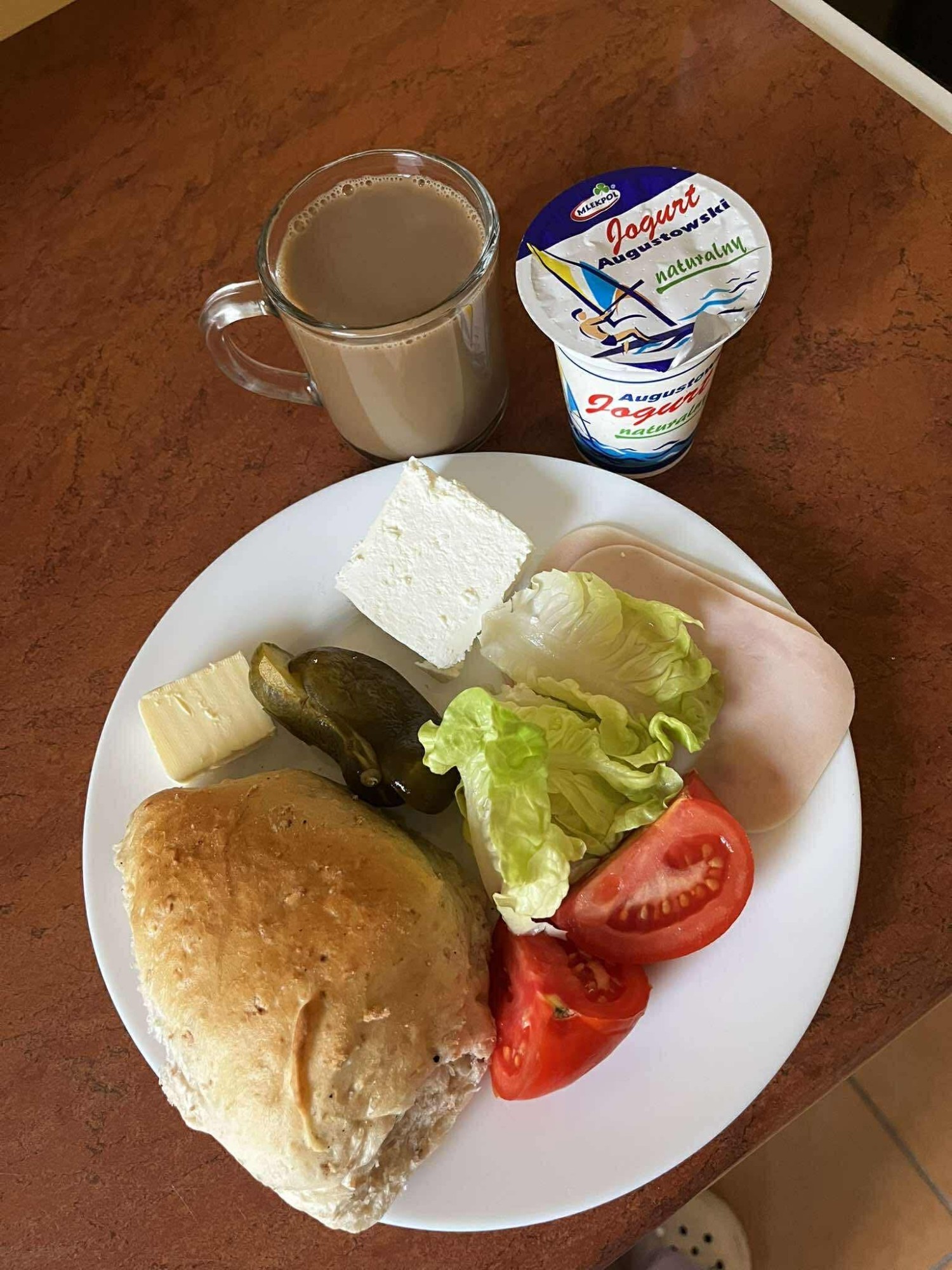 GRAMATURA: Chleb razowy 100g (MLEKO, PSZENICA, ŻYTO, JĘCZMIEŃ), Masło 15g (ŚMIETANKA), Twaróg krajanka plaster 50g ( MLEKO), Pomidor 50g , Sałata masłowa 5g, Ogórek kiszony 40g, Schab ze spiżarni 20g (GLUTEN, SELER, GORCZYCA), Kawa zbożowa. 250g (MLEKO, ŻYTO, JĘCZMIEŃ), II Śniadanie: Jogurt naturalny 1szt (MLEKO)