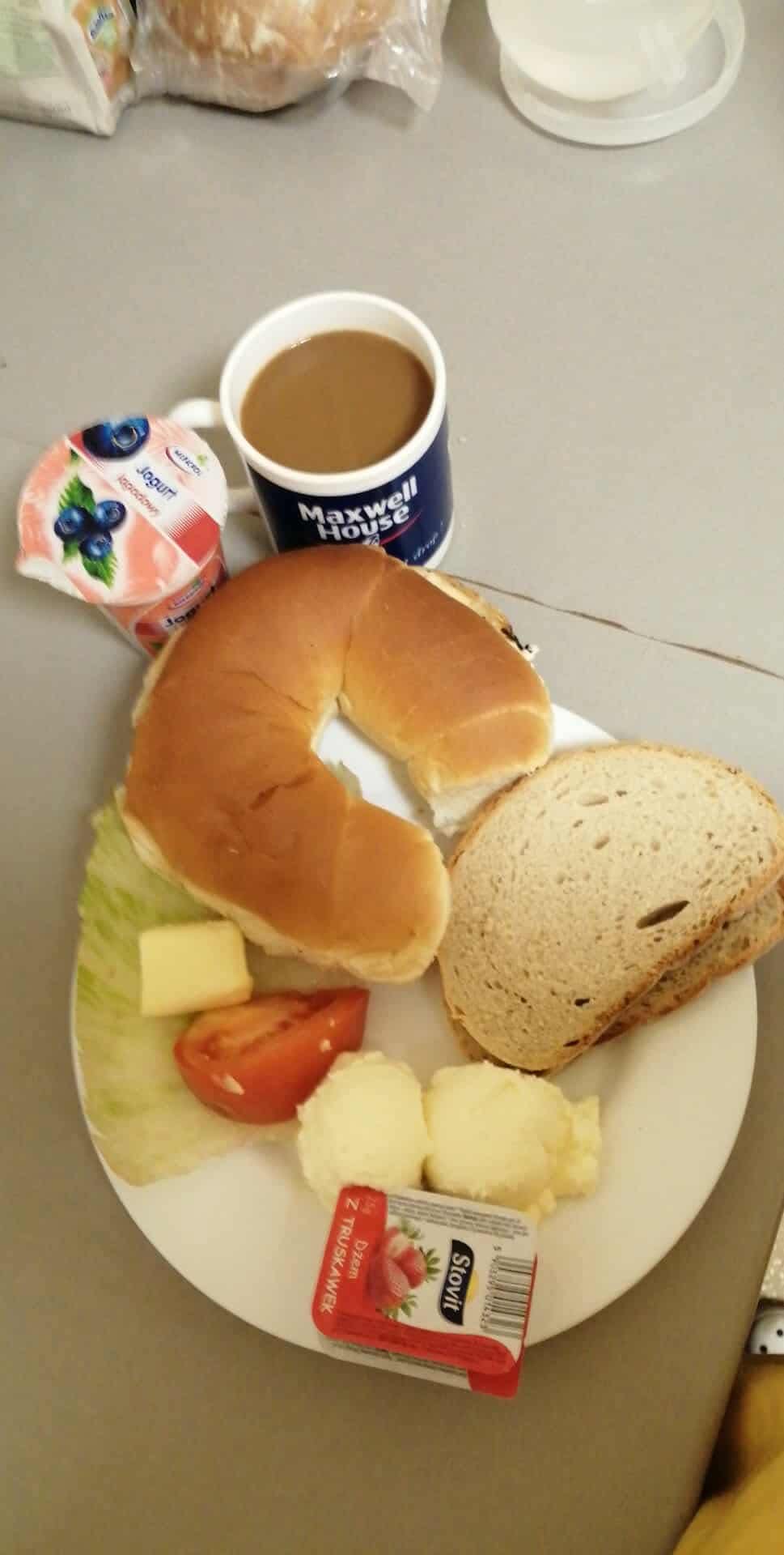 GRAMATURA: Rogal maślany 1szt (MLEKO, GLUTEN, JAJA, SEZAM), Masło 15g (ŚMIETANKA), Twarożek waniliowy 50g , Dżem 2x25g 2szt , Kawa zbożowa. 250g (MLEKO, ŻYTO, JĘCZMIEŃ ), II Śniadanie: Jogurt owocowy 1szt (MLEKO)