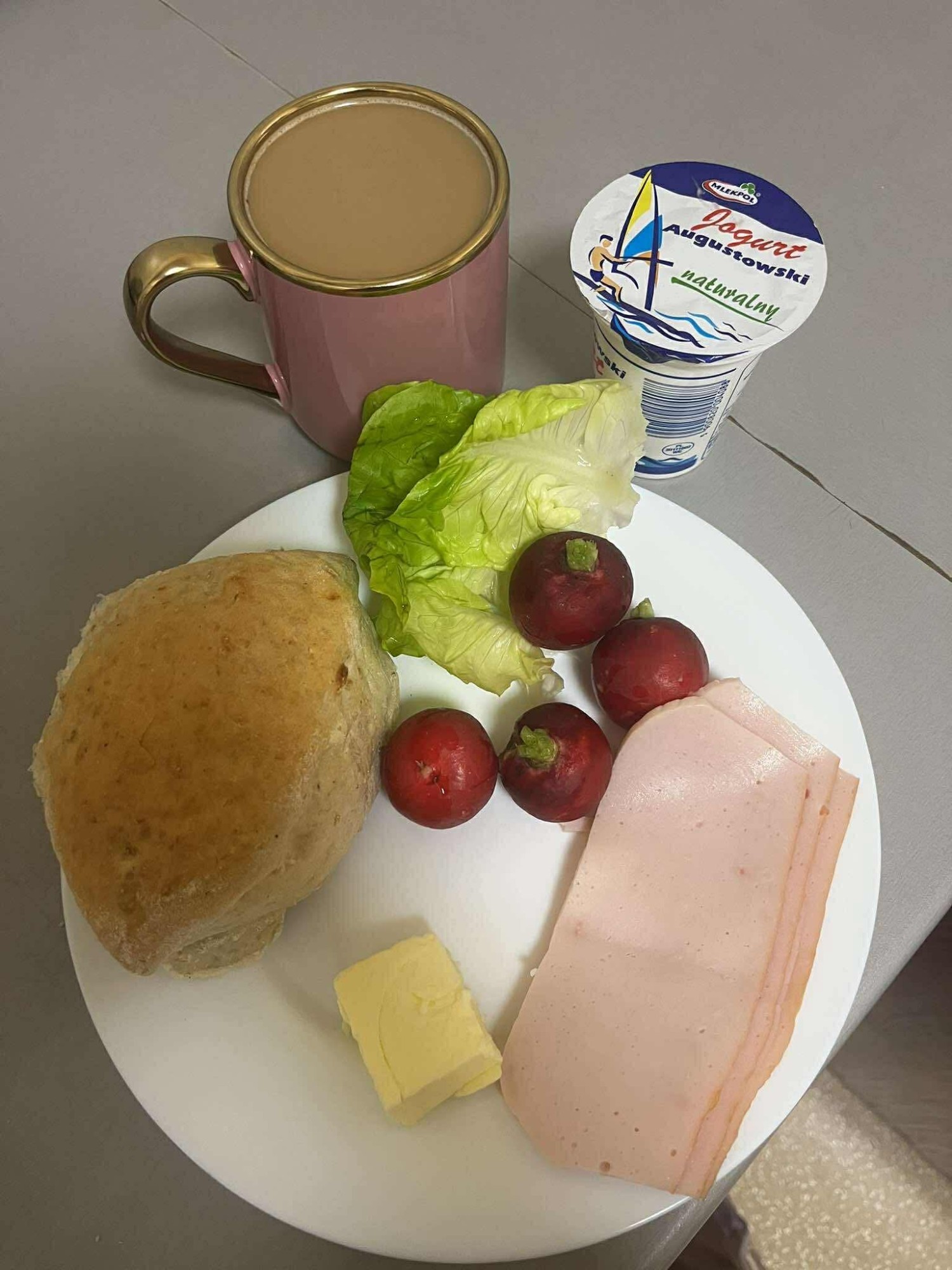 GRAMATURA: Pieczywo mieszane 100g (MLEKO, PSZENICA, ŻYTO, JĘCZMIEŃ), Masło extra 15g (ŚMIETANKA), Szynka piastowska 50g, Rzodkiewka 80g , Herbata 250ml , Sałata masłowa 5g , II Śniadanie: Jogurt naturalny 150g 1szt (MLEKO)