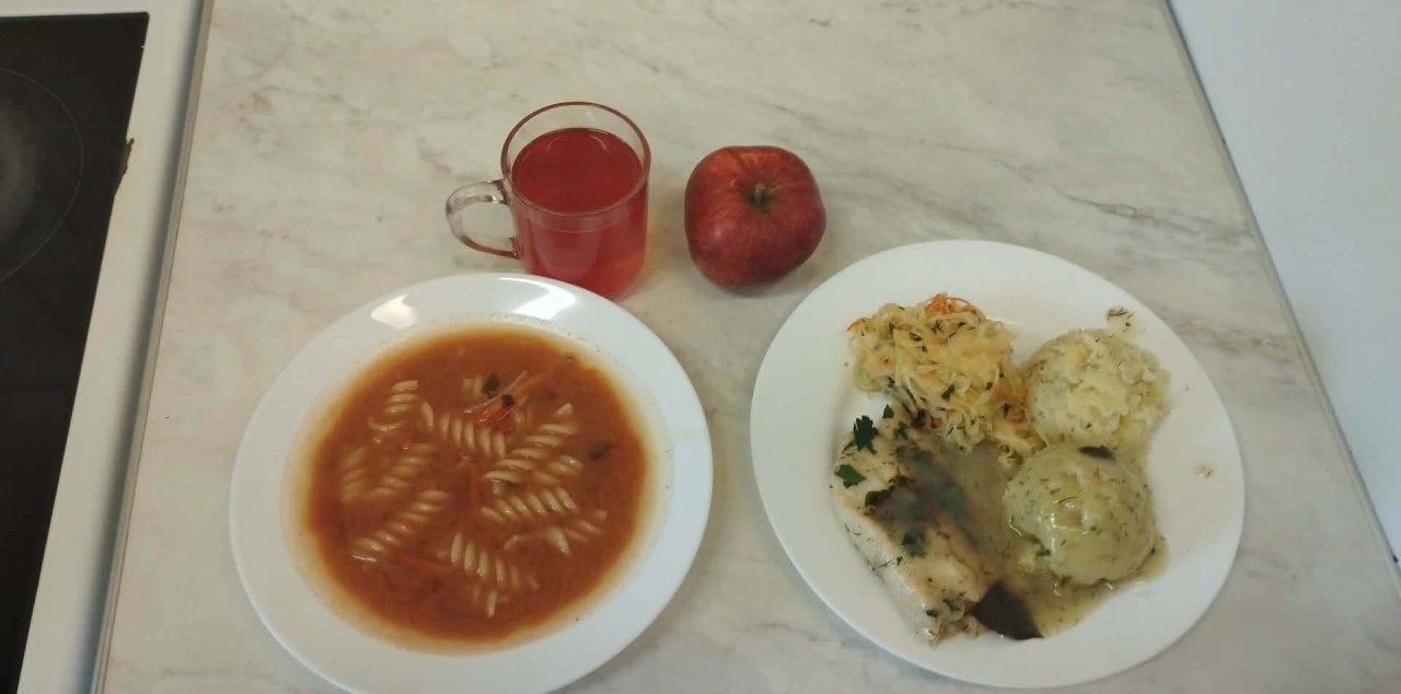 GRAMATURA: Zupa pomidorowa z makaronem 350ml (GLUTEN, JAJA, PSZENICA, SELER, SOJA ), Miruna na parze 100g (RYBY), Ziemniaki 200g , Fasolka szparagowa 200g, Kompot owocowy 250ml ( S02)