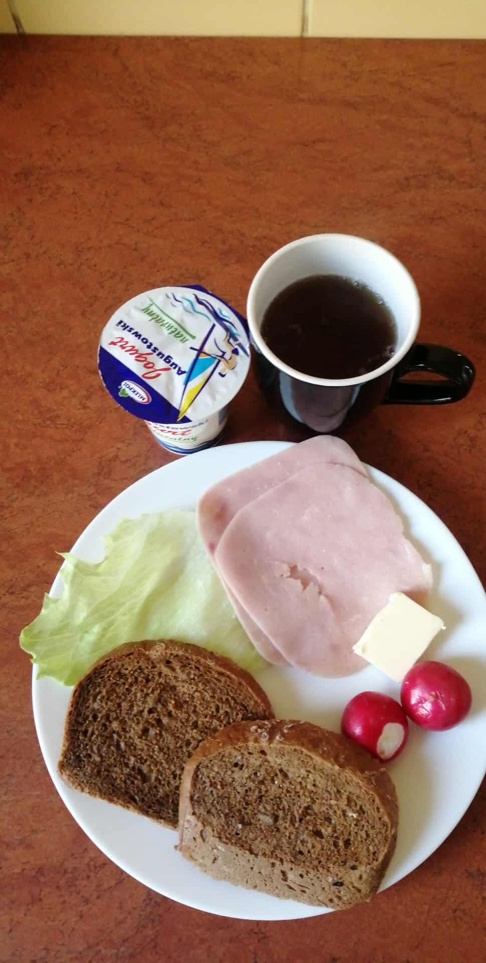 GRAMATURA: Chleb razowy 100g (MLEKO, PSZENICA, ŻYTO, JĘCZMIEŃ), Masło 15g (ŚMIETANKA), Szynka piastowska 50g , Rzodkiewka 50g , Sałata masłowa 5g , Kawa zbożowa. 250g (MLEKO, ŻYTO, JĘCZMIEŃ), II Śniadanie: Jogurt naturalny 1szt (MLEKO)