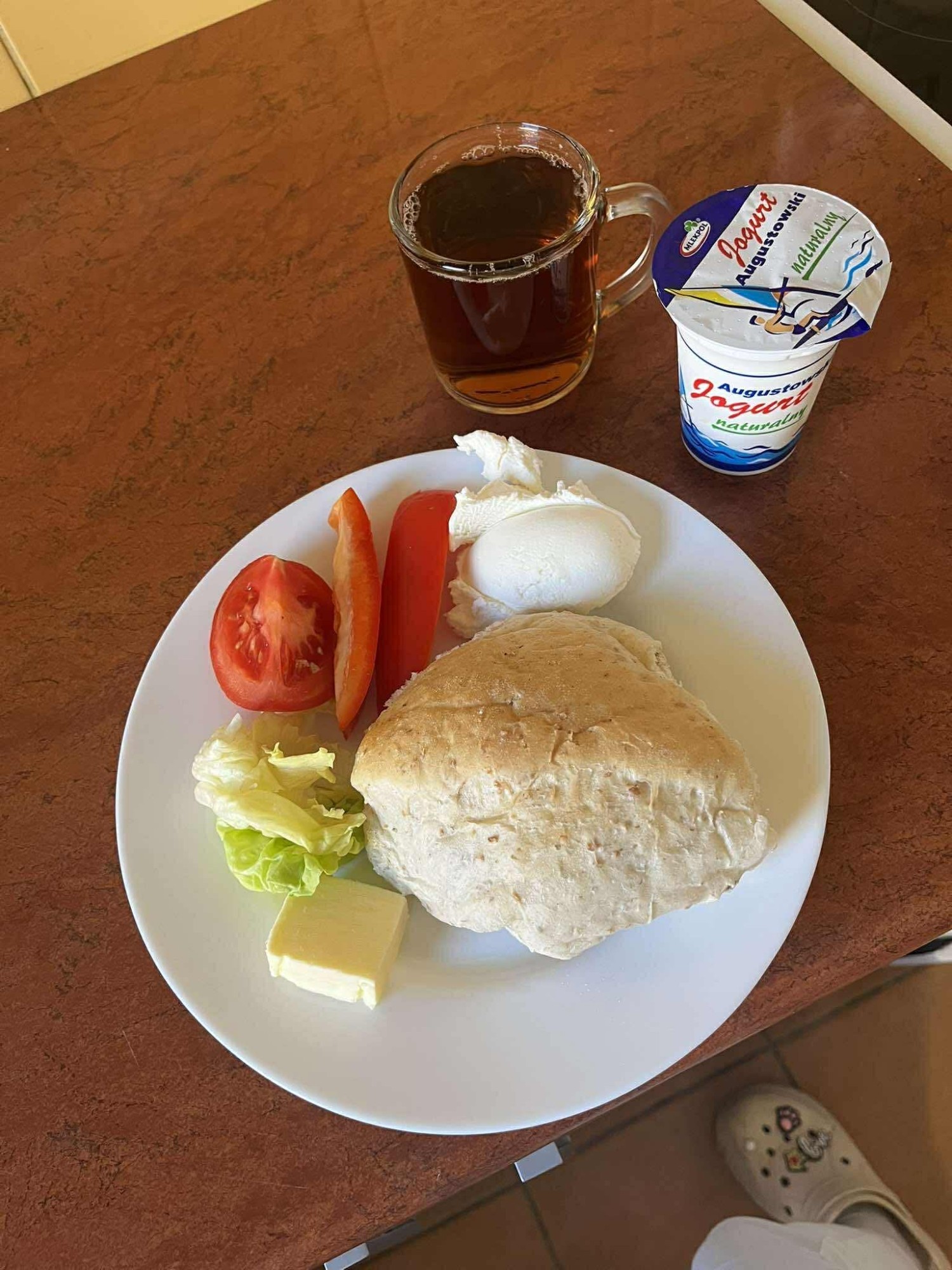 GRAMATURA: Pieczywo mieszane 100g (MLEKO, PSZENICA, ŻYTO, JĘCZMIEŃ), Masło extra 15g (ŚMIETANKA), Jajka gotowane kl. L 2szt (JAJA), Pomidor 50g , Herbata 250ml , Sałata masłowa 5g, II Śniadanie: Jogurt owocowy 150g 1szt (MLEKO)